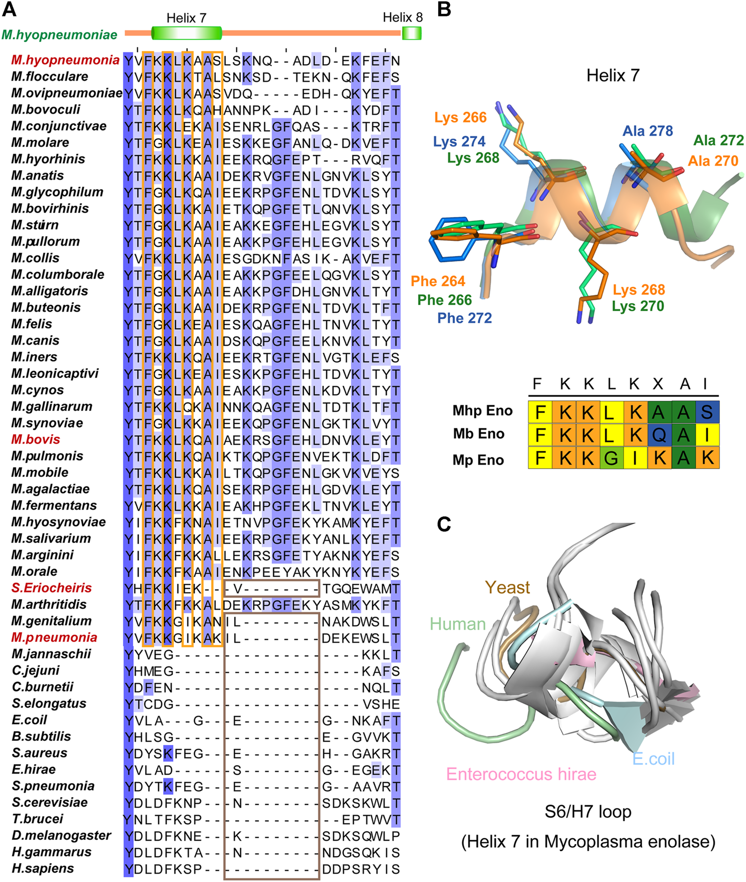 Helix 7 motifs and structures. (A) Sequence alignment of the H7/H8 regions of different enolases. For sequence accession numbers, please refer to supplementary materials. The secondary structure of Mhp Eno is indicated above the alignments. The conserved sites in the mycoplasma enolase H7 region are highlighted with orange rectangles. The absence of H7 and H8 in enolase structures is highlighted with brown rectangles. (B) Structures of helix 7 from three mycoplasma enolases. Blue, green and orange indicate Mp Eno, Mb Eno and Mhp Eno, respectively. Conserved sites are indicated and shown stick models. The H7 motifs in Mp enolase, Mb enolase and Mhp enolase are shown under the H7 structures. (C) Structural overlap of the S6/H7 loops (corresponding to Helix 7 of Mycoplasma enolases) of enolases from non-Mycoplasma species. Enolases from H. sapiens, S. cerevisiae, E. coli and E. hirae are shown in light green, light blue, brown and pink, respectively, and other enolases are shown in white.