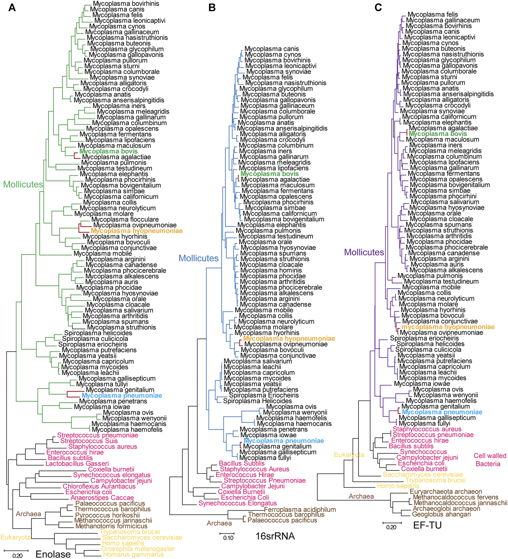 Mycoplasmas are a distinct class of prokaryotes that are wall-less, free-living and small in size and can pass through bacteriologic filters. They have unusually small genomes with sizes of 0.5–1 Mbp and have nearly the minimal gene set required for metabolism, showing unusual nutritional needs. These abnormal phenotypic characteristics are the major basis for defining these species as Mollicutes. Mycoplasma is used as the general name for species in the class Mollicutes. In the traditional method of classification, Mollicutes is the sole class of Tenericutes and is composed of five orders: Acholeplasmatales, Anaeroplasmatales, Entomoplasmatales, Haloplasmatales and Mycoplasmatales, among which the genus Mycoplasma of the order Mycoplasmatales contains the largest number of species, which at over 120. One widely accepted hypothesis states that mycoplasmas evolved from the ancestors of gram-positive bacteria by several rounds of genome reduction (Rogers et al., 1985; Sladek, 1986). Structural information from the histidine-containing phosphocarrier protein of Mycoplasma capricolum provided solid evidence for the evolutionary divergence of Mycoplasma from gram-positive bacteria (Pieper et al., 1995). Based on 16S rRNA phylogenetic studies of mycoplasmas, Woese et al., hypothesized that Mollicutes are not a phylogenetically coherent group in which all species are derived from a common ancestor; instead, they may represent a diverse collection of wall-less microorganisms derived from many different branches of bacteria (Woese et al., 1980). However, this theory has not been proven, and recent studies have still suggested that Mollicutes originated from one common Gram-positive bacterial ancestor or that Mollicutes have a monophyletic origin within Firmicutes (Ciccarelli et al., 2006). However, Woese’s studies presented a new method of Mollicutes classification, which includes five phylogenetic groups: the hominis group, the pneumoniae group, the spiroplasma group, the anaeroplasma group and the asteroleplasma groupare (Weisburg et al., 1989). Recently, a new classification method based on genome sequence data suggested the creation of the new order Mycoplasmoidales ord. nov., containing two new families (Gupta et al., 2018). Currently, the results of phylogenetic analyses of Mollicutes are controversial.