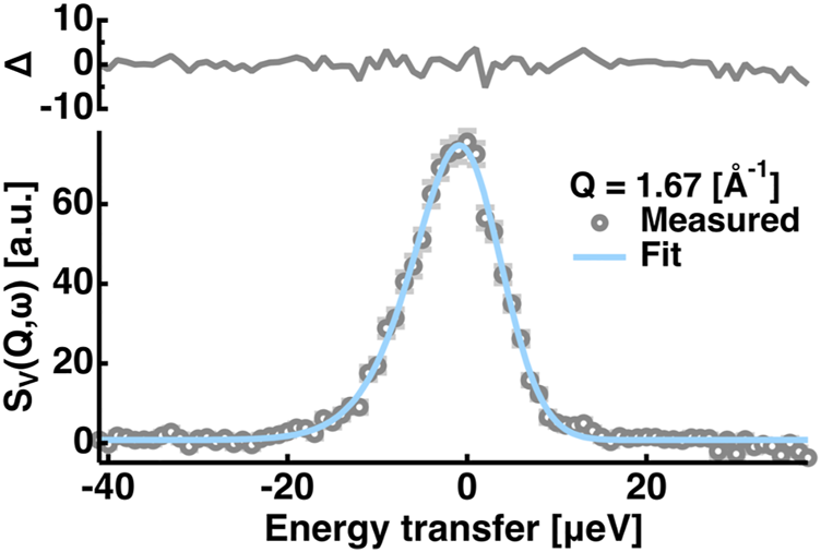 Example of the fitting of the QENS spectra of the vanadium. Those at Q = 1.67 [Å−1] are shown. Grey open circles denote the measured data points and the cyan solid line denotes the fit. The residuals (Δ) of the fitting are shown in the upper side of the panel. Error bars are shown in light grey and they are within the symbols if not shown.