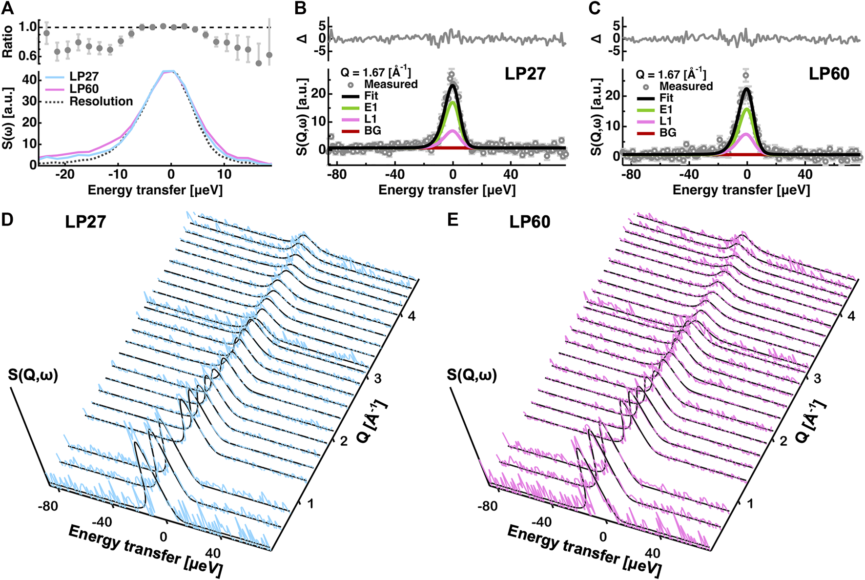 Analysis of the QENS spectra. (A): Comparison of the QENS spectra integrated over all the Q-range measured. Those of LP27 and of LP60 are denoted by cyan and magenta lines, respectively. The resolution function is represented by a dotted line. In the upper panel, the intensity ratio of LP27 to LP60 is shown. (B,C): Examples of the fitting of the QENS spectra at Q = 1.67 [Å−1] of LP27 (B) and LP60 (C). Experimental data points are denoted by grey open circles. The total fit (Fit), the elastic component (E1), the Lorentzian function (L1), and the background (BG) are denoted by black, green, magenta, and brown lines, respectively. In the upper panel, the residuals (Δ) between the measured and the fitting values are shown. Error bars are shown in light grey. (D,E): Comparison of the obtained QENS spectra and the corresponding fits at all the Q values measured for LP27 (D) and LP60 (E). The experimental QENS spectra in (D,E) are shown in cyan and magenta, respectively. The fits are shown by black lines.