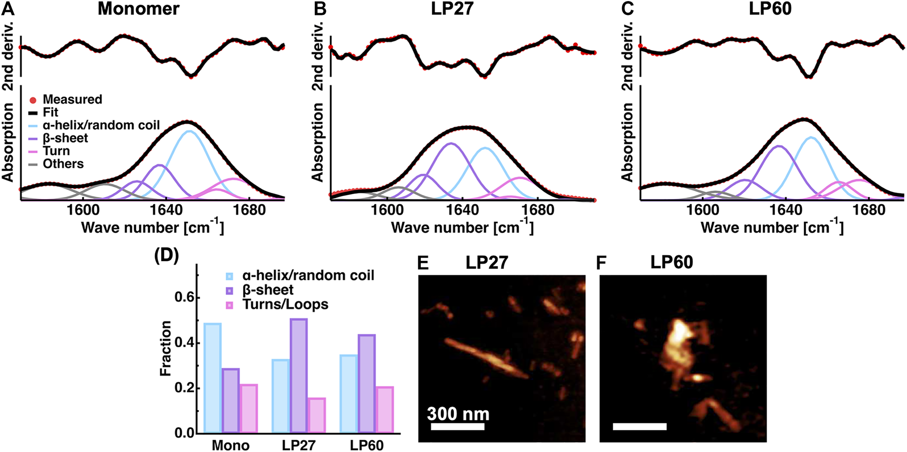 Sample characterization. (A–C): ATR-FTIR spectra of HEWL monomers (A) and HEWL polymorphs formed at pH 2.7 [LP27; (B)] and at pH 6.0 [LP60; (C)]. The second derivatives of the spectra and the fitting results are also shown. Red filled circles denote the experimental data points and black solid lines denote the fits. The solid lines in cyan, purple, magenta, and grey represent the contributions from α-helices/random coils, β-sheets, turn structures, and other contributions, respectively. (D): The secondary structure content of the samples estimated from the spectra shown in (A–C). (E–F): AFM images of LP27 (E) and LP60 (F) shown using the software Gwyddion (Nečas and Klapetek, 2012). The scale bars correspond to 300 nm.