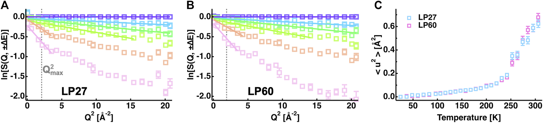 MSD analysis of the EINS curves. (A,B): Q2-dependence of the logarithm of the EINS curves of LP27 (A) and LP60 (B) normalized by that at the lowest temperature of 24 K. The temperatures of these curves are 24, 96, 147, 200, 252, and 295 K (from top to bottom). The corresponding Gaussian fits are denoted by solid lines. For reference, in (A,B), values, which are the square of the maximum Q values where the Gaussian approximation is strictly valid (), are denoted by grey dotted lines. was evaluated at the highest temperature of each sample, where the decay of the EINS curves with increasing Q is the steepest. (C): MSD values as a function of temperature. Those of LP27 and of LP60 are denoted by open squares in cyan and magenta, respectively. In all the panels, error bars are within the symbols if not shown.
