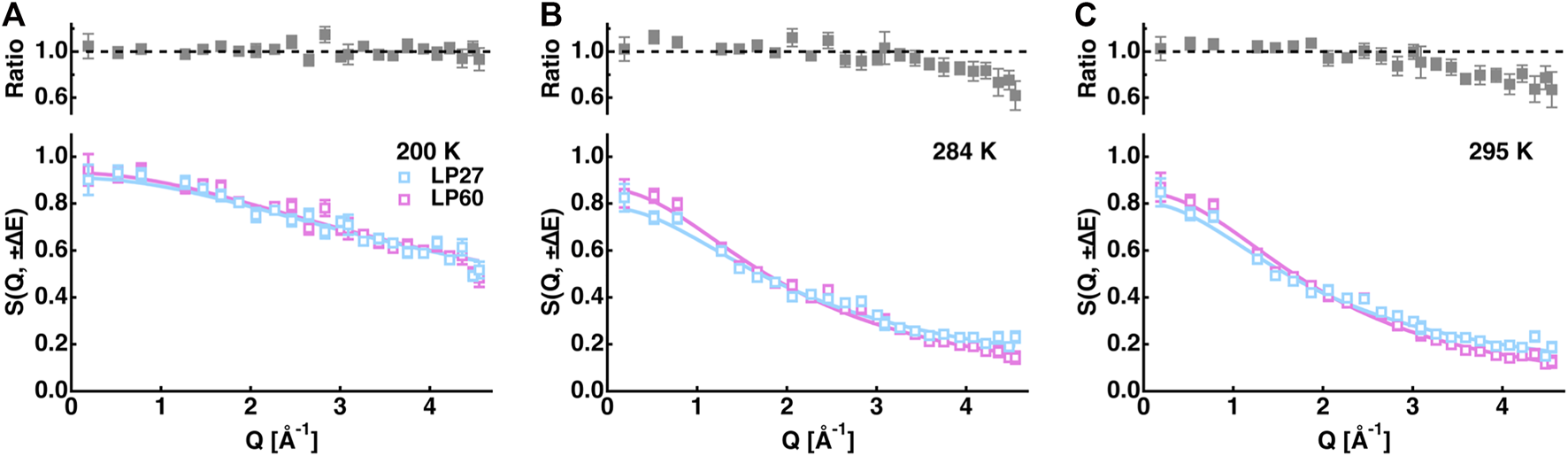 Comparison of the EINS curves between LP27 and LP60 at 200 K (A), 284 K (B), and 295 K (C). The upper panels show the intensity ratio of LP60 to LP27. The cyan and magenta open squares denote the experimental data points of LP27 and LP60, respectively. The solid lines are the corresponding fits obtained by Eq. 2 in the main text.