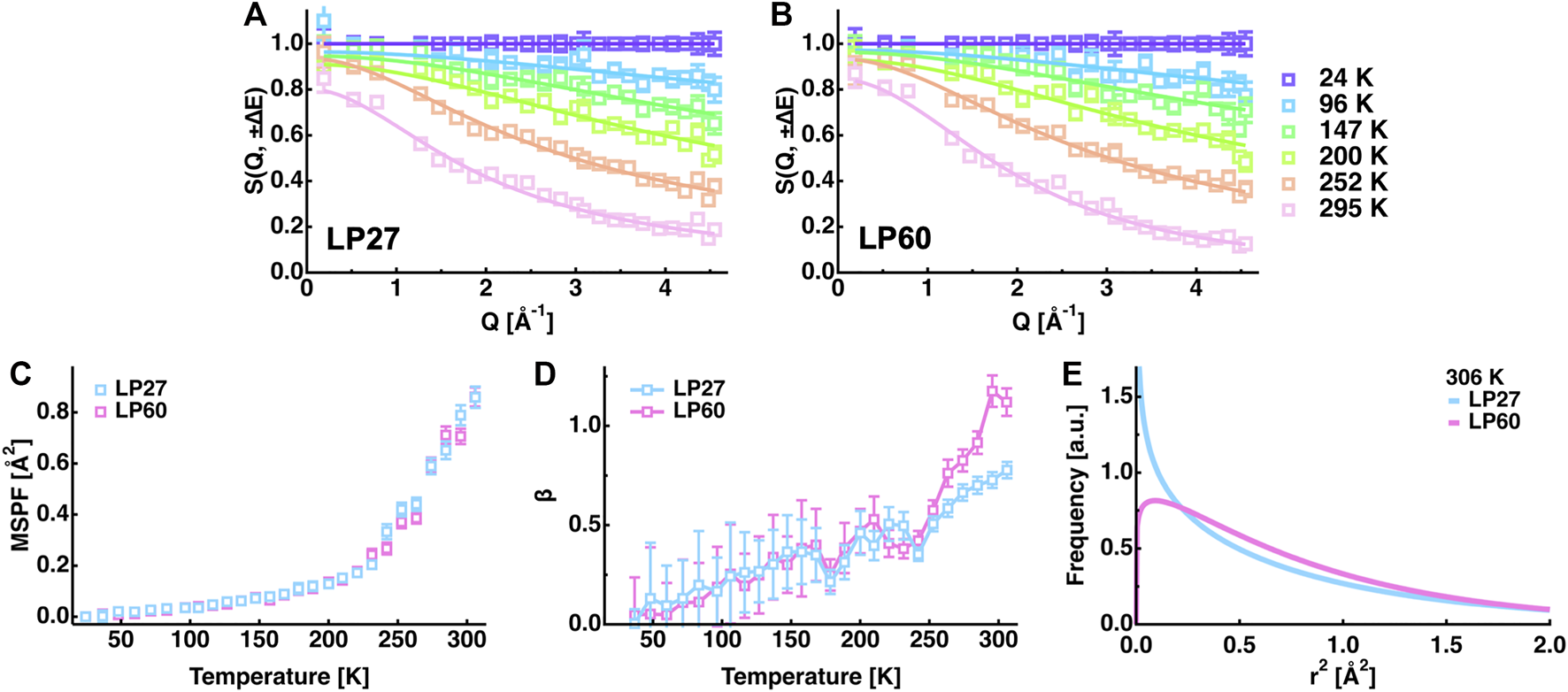 Summary of the MSPF analysis. (A,B): EINS curves of LP27 (A) and LP60 (B) as a function of Q. The temperatures of these curves are 24, 96, 147, 200, 252, and 295 K (from top to bottom). The corresponding fits by Eq. 2 in the text are shown by solid lines. (C): MSPF values as a function of temperature. Those of LP27 and of LP60 are denoted by cyan and magenta open squares, respectively. The same color notation is used in (D,E). (D): The measure of motional homogeneity (β) as a function of temperature. (E): Distribution of the squared amplitudes of atomic motions at 306 K obtained by the MSPF analysis. In all the panels, error bars are within the symbols if not shown.