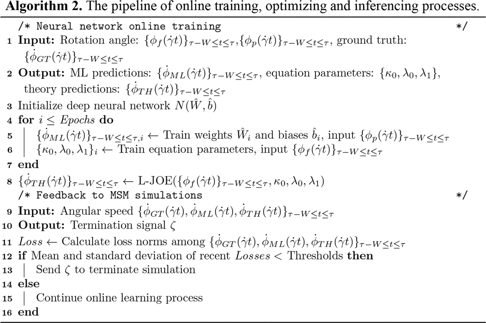 A customized loss function, measuring the difference between data from MSM and basic physics, is introduced for predicting parameters in BIOL (Algorithm 2). The two terms in the loss function measure the coupled effects from both MSM (the first term) and basic physics (the second term).where the first term trains to optimize the weights and the biases while the second term trains the proposed equation to optimize its parameters. Naturally, a function , the difference between the ground truth and the theory, evaluates the predictions. are norm functions where we generally use Mean Squared Error (MSE). The training and validation use the most recent randomly sampled historical data and evaluation uses the freshly generated data for accuracy measurements, to accommodate the fact that dynamics are highly time sensitive. The last component of BIOL is to correlate ML with MSM and integrate them with the time series for online learning, inferencing, and feedback with signal ζ. Coupled ML and MSM leverage their respective strengths to identify the system equations and parameters of the ill-posted problems with sparse and noisy data at multiple spatial and temporal scales (Peng et al., 2020).