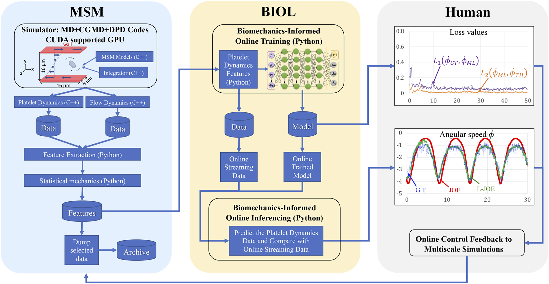 Workflow for integrated MSM and BIOL. The MSM simulator is implemented by C++ and extracted data are processed by Python. Specific features related to platelet rotation, e.g., rotation angle and angular speed, are randomly sampled to feed into BIOL for solving equations of motion in time for simulation. A human, as an external intelligent side, controls the learning frequency and feedback to MSM with online predictions.