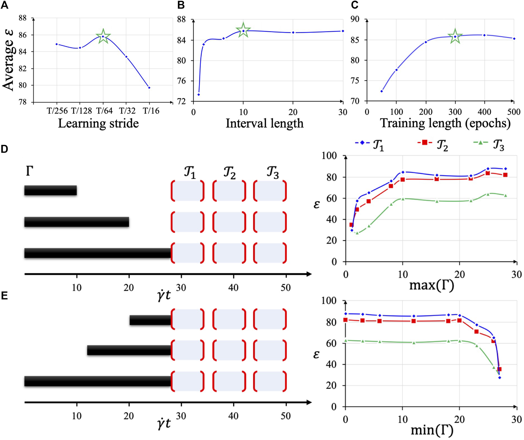 Hyperparameter selection based on average test accuracy (A–C). Using the optimal hyperparameter combination, different lengths of sequences (D, E) are fed as online training inputs, then evaluated by three different future tests . The online predicted dynamical features are temporal sensitive. Deformable platelet at 100 dyne/cm2 is used as the presenting example.