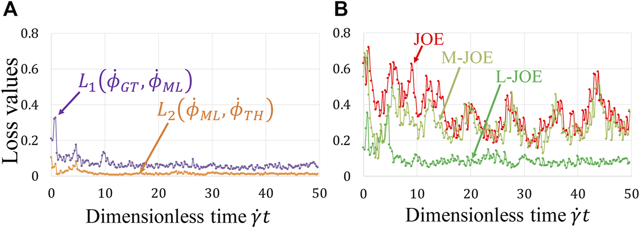 Loss function during online learning (A) and prediction accuracy between JOE, M-JOE, and L-JOE (B), for the rigid platelet at 50 dyne/cm2.