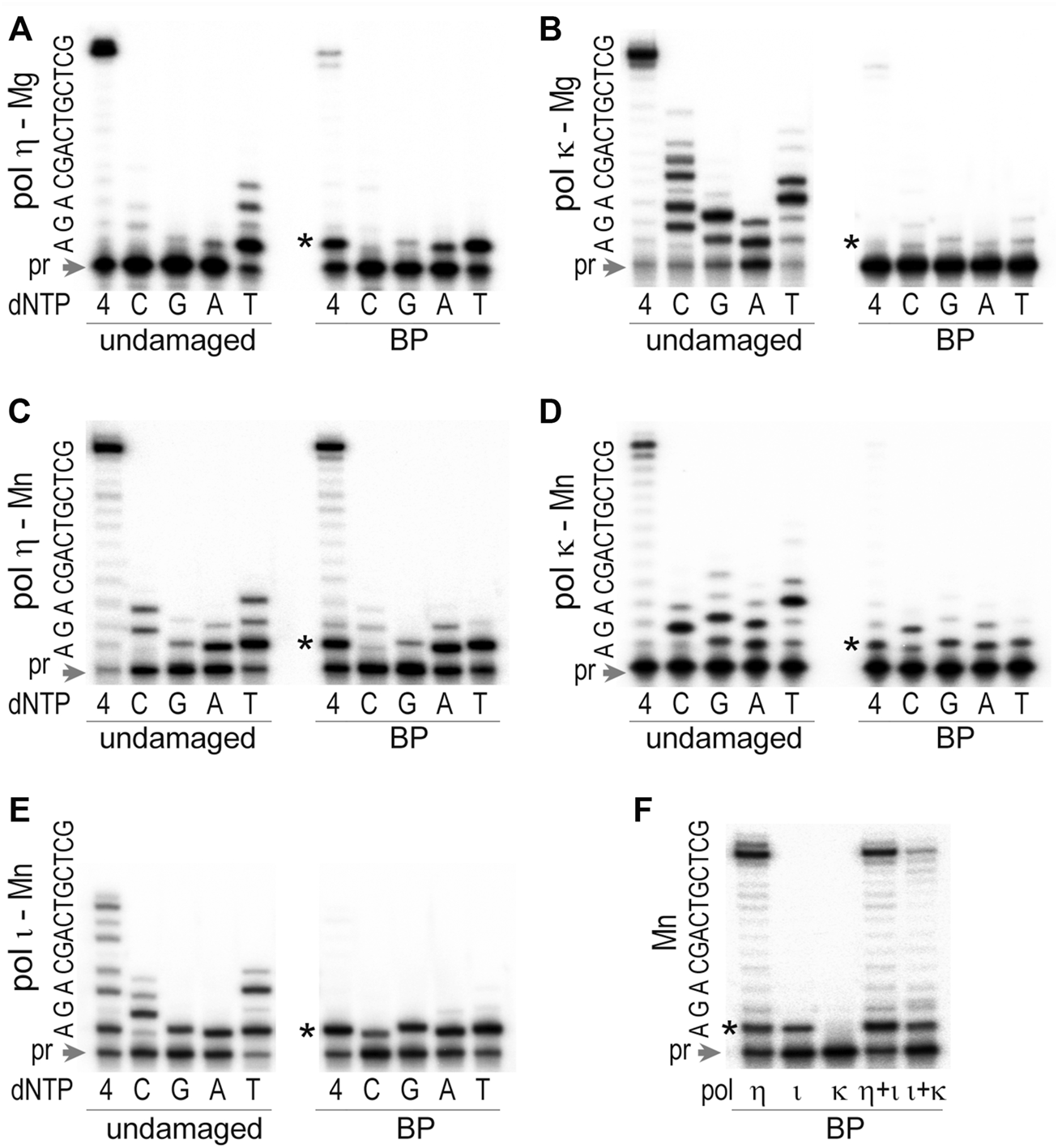 TLS past trans-S-BPDE-dA by T. lanuginosus pols. The ability to bypass BPDE-dA was assayed for (A) polη in thepresence of 4 mM Mg2+, (B) polκ in the presence of 4 mM Mg2+, (C) polη in the presence of 4 mM Mn2+, (D) polκ in the presence of 4 mM Mn2+, (E) polι in the presence of 4 mM Mn2+, and (F) individual, or a mixture of various pols in 4 mM Mn2+. The substrate used in these assays was made by annealing of the 32P labeled primer 5′-CACTGCAGACTCTAAA-3′ and either an undamaged or BPDE-containing template 5′- GCTCGTCAGCAGATTTAGAGTCTGCAGTG-3′, where the underlined bold A stands for the undamaged, or BPDE modified dA. Reactions contained 100 μM each of individual nucleotide (dC, dG, dA, and dT) or a mixture of all four dNTPs as indicated in the figure and were carried out at 37°C for 10 min. Concentrations of enzymes were 0.17 pM for polη, 0.32 pM for polκ, and 0.15 pM for polι. The sequence of the template immediately downstream of the primer (pr) is shown on the left-hand side of each gel pair. The star (*) indicates the position of the adduct.