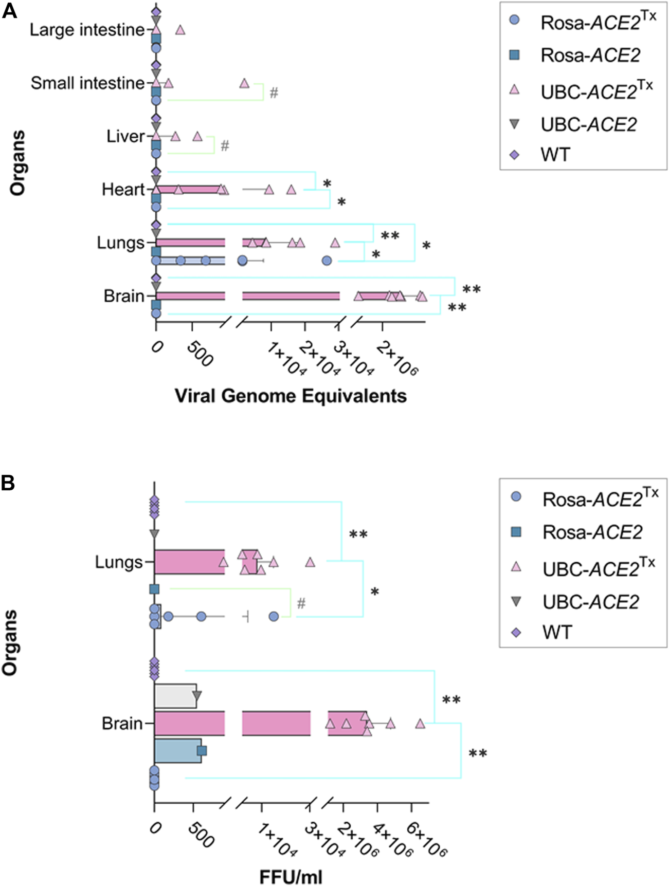 SARS-CoV-2 genome equivalent (A) and focus-forming unit (B) analyses in different samples of mouse organs on the 5th day of infection. (A) Significant differences between WT and UBC-ACE2Tx and between Rosa-ACE2Tx in heart and brain; significant differences between overall UBC-ACE2Tx, Rosa-ACE2Tx and WT in lungs. (B) Significant differences between WT and UBC-ACE2Tx and between Rosa-ACE2Tx in lungs and brain; Note: *p < 0.05, **p < 0.001, #p < 0.1.