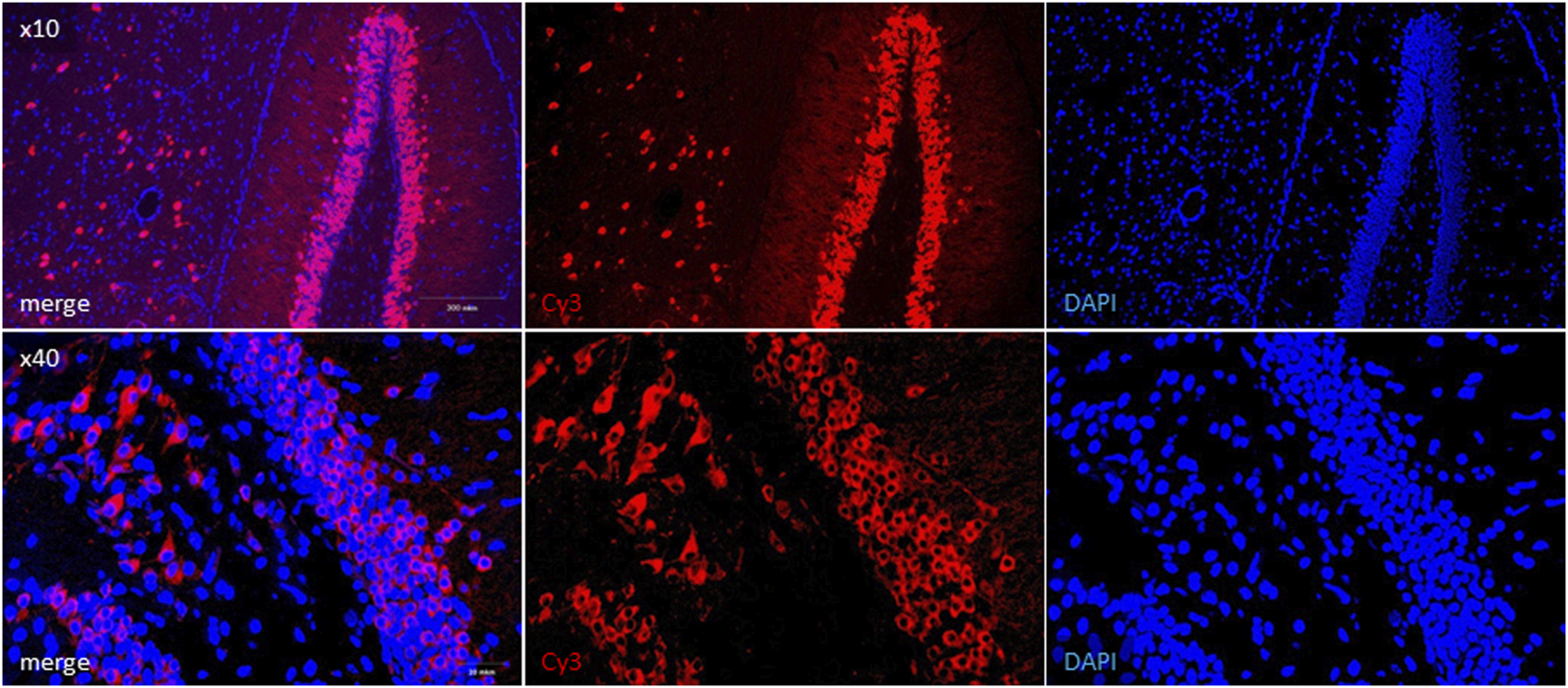 Immunohistochemical detection of SARS-CoV-2 N-protein in UBC-ACE2Tx brain samples. Viral N-protein was labeled with Cy3-conjugated secondary antibody (red field). Cell nuclei and DNA were stained with DAPI (blue field).