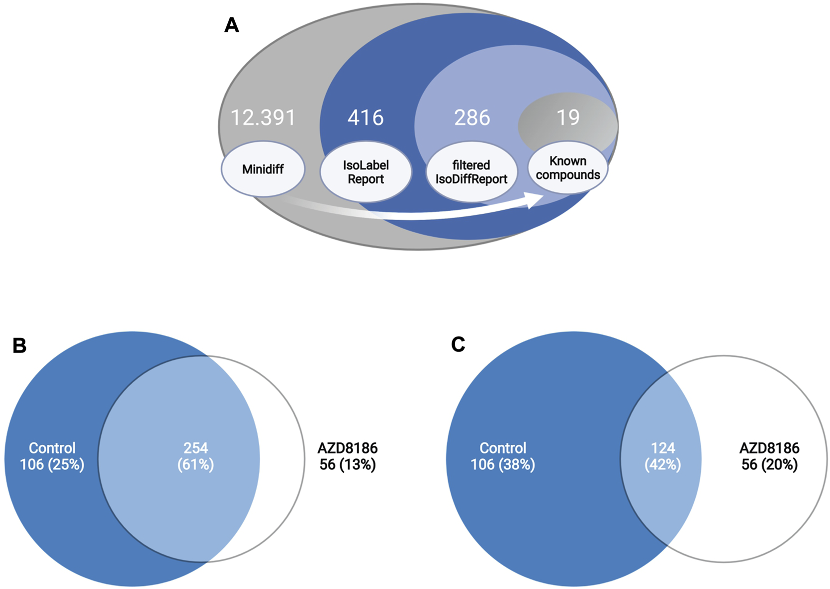 Differential labeling analysis of MDA-MB-468 cells treated for 24 h with vehicle or 0.5 µM AZD8186. Schematic display of the feature filtering procedure with the number of features obtained in the different processing steps (A). Euler diagram of total labeled isotopologue groups in vehicle and AZD8186 treated cells (IsoLabelReport; Supplementary Table S4) (B). Euler diagram of differentially labeled isotopologue groups between vehicle and AZD8186 treated cells (filterIsoDiffReport; Supplementary Table S5) (C).