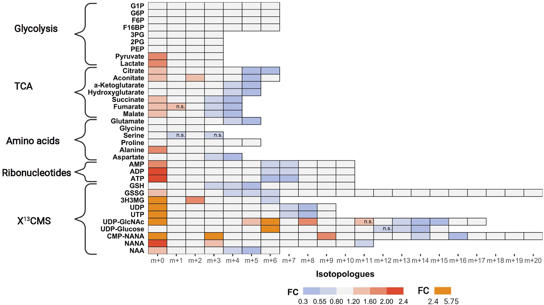 Impact of AZD8186 treatment on 13C tracer incorporation into different metabolic pathways. MDA-MB-468 cells were cultivated in RPMI with [U-13C] glucose and treated with 0.5 µM AZD8186 or vehicle for 24 h. Fold changes (AZD8186 vs. vehicle) of the individual isotopologues were calculated from the average labeling fraction of three technical replicates per condition and are represented by the indicated colour code. Only effects are displayed in the heatmap that exhibit a FC < 0.8 and >1.2 and tracer incorporation >3% (average of labeling fraction in control and treatment group). Information on alterations of isotopologues that do not fulfill these FC limits as well as information on results from statistical testing (adjusted p-value; Welch’s t test) can be obtained from Supporting PDF. Isotopologues that are not significantly altered are indicated (n.s.). Fractional abundance information is provided in Supplementary Table S2. G1P, Glucose-1 phosphate; G6P, Glucose-6 phosphate; F6B, Fructose-6,- phosphate; F16BP, Fructose-1,6,-bisphosphate; 3 PG, 3-Phosphoglycerate; 2 PG, 2-Phosphoglycerate; PEP, Phosphoenolpyruvate; 3H3MG, 3-Hydroxy-3-methylglutarate; AMP/ADP/ATP, Adenosine mono/di/triphosphate; GSH, glutathione; GSSG, oxidized glutathione; UDP/UTP, Uridine di/triphosphate; UDP-GlcNAc, Uridine diphosphate N-acetylglucosamine; NANA, N-acetylneuraminate; CMP-NANA, cytidine monophosphate N-acetylneuraminate; NAA, N-Acetylaspartate.