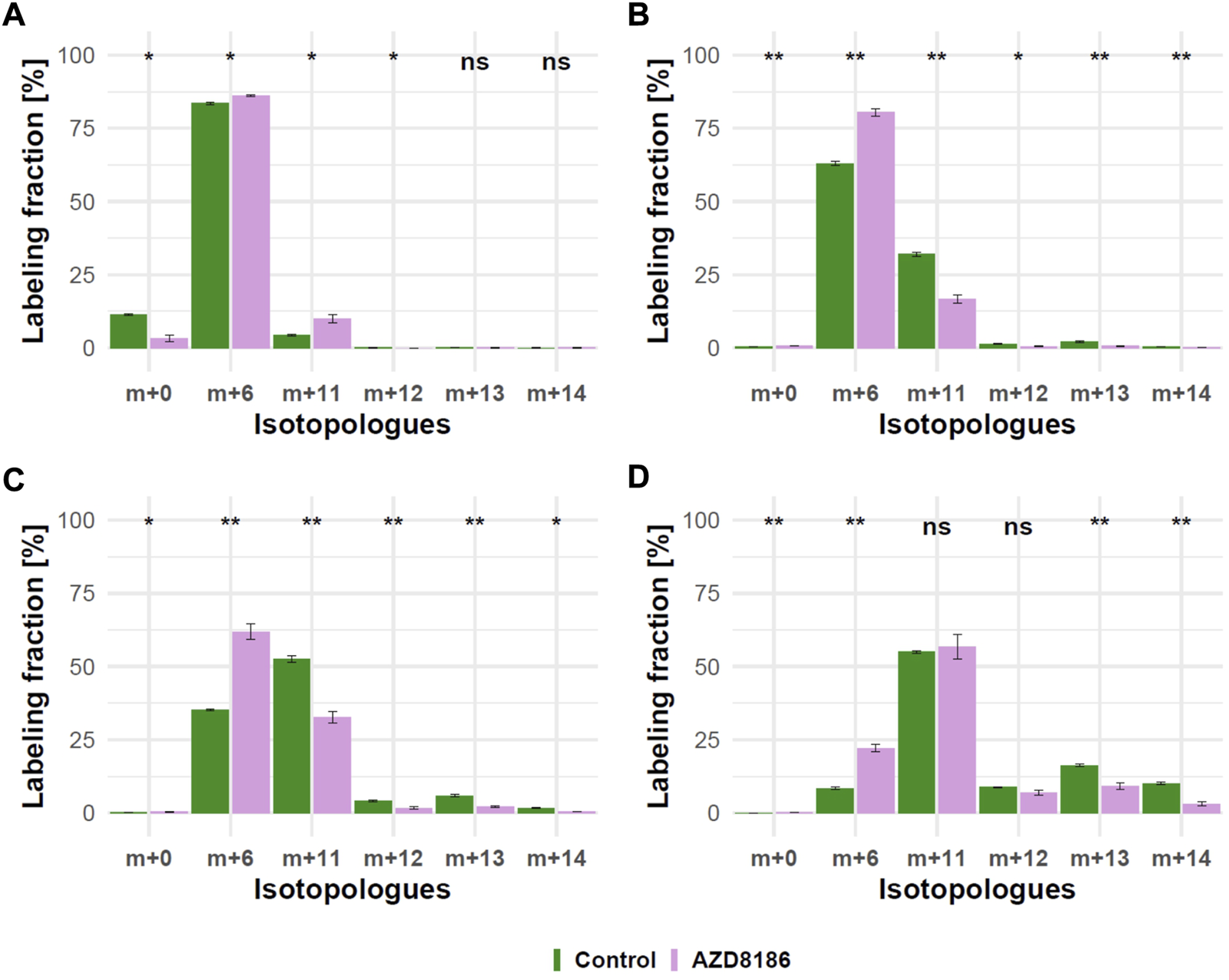 Time course of 13C tracer incorporation in UDP-Glucose. MDA-MB-468 cells were cultivated in RPMI with [U-13C] glucose and treated with 0.5 µM AZD8186 (purple) or vehicle (green). Bar charts ±standard deviation (n = 3 technical replicates) showing the fractional enrichment of 13C into UDP-Glucose at 1 h (A), 3 h (B), 6 h (C) and 24 h (D) sampling times. *p < 0.05; **p < 0.01 (adjusted p-value; Welch’s t-test).