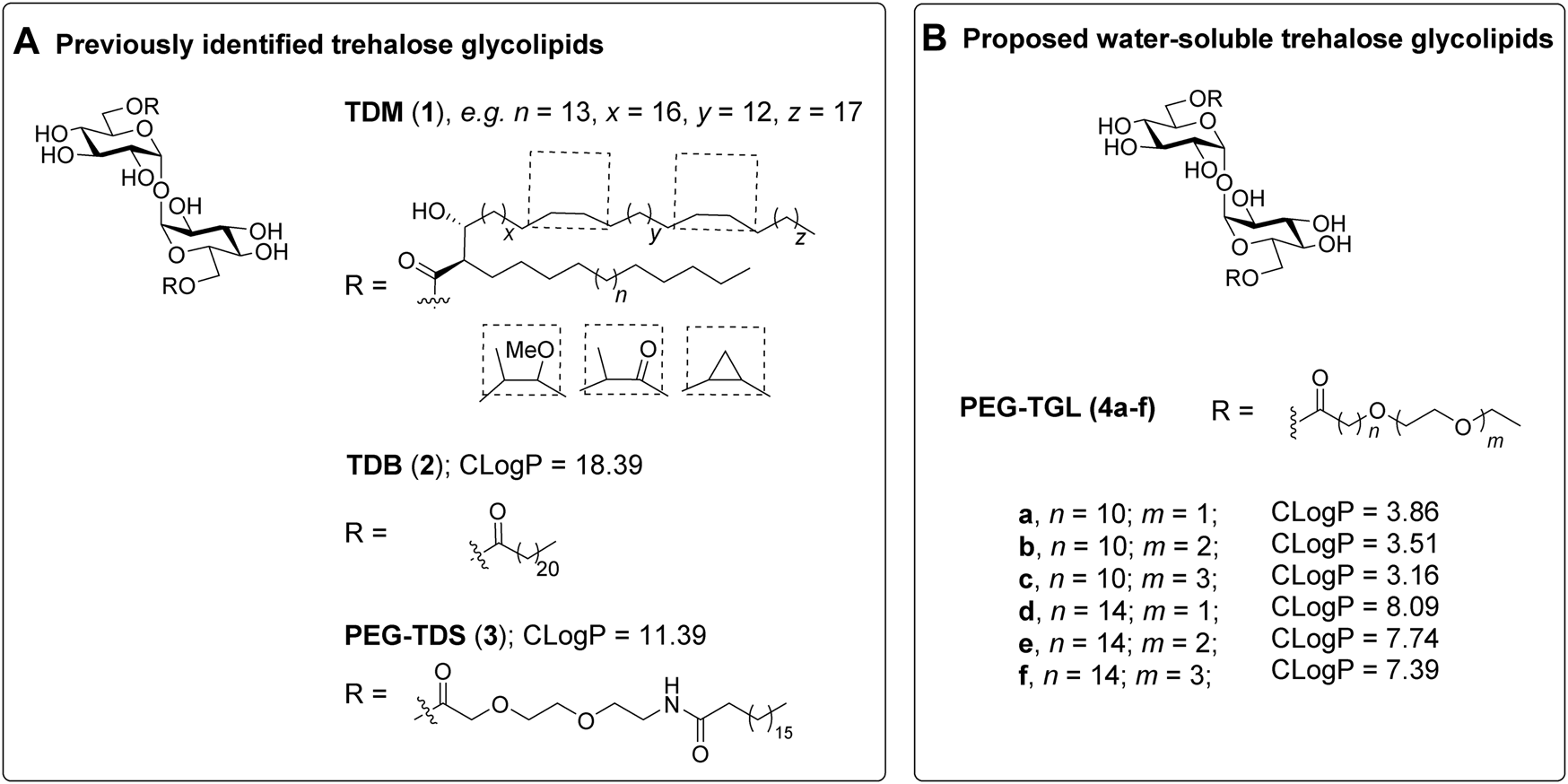 Trehalose glycolipids as Mincle-adjuvants. (A). The previously reported trehalose glycolipids TDM (1) (Ishikawa et al., 2009) and TDB (2) (Schoenen et al., 2010) exhibit good Mincle-mediated adjuvanticity, however water-soluble adduct, PEG-TDS (3) (Huber et al., 2016) exhibits only modest adjuvanticity, which was attributed to poor mMincle binding. (B) We proposed that PEGylated trehalose glycolipids 4a-f would retain good Mincle binding due to the positioning of the PEG groups at the terminus of the lipid. The calculated LogP values provide an indication of water solubility.