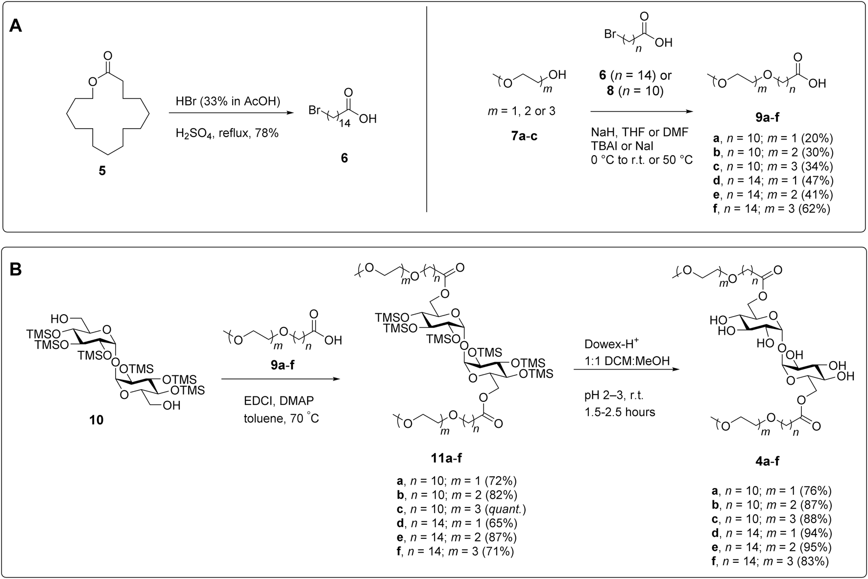 Synthesis of PEG-TGLs. (A) Preparation of the carboxylic acids required to install the PEGylated side chain. (B) Conjugation of the suitably functionalized trehalose scaffold (Khan et al., 2011) to the carboxylic acid side chains and deprotection to give the target PEG-TGLs (4a-f).