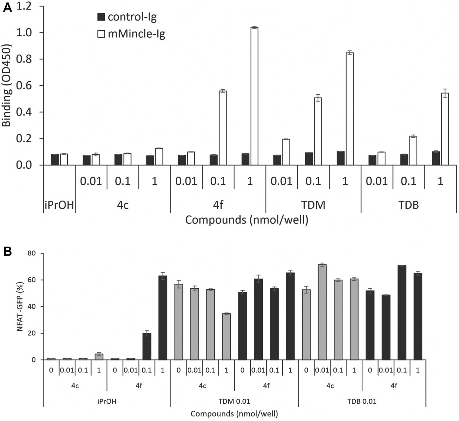 Water-soluble analogue 4f is a better ligand for mMincle compared to TDB and TDM but does not competitively inhibit the binding of TDB or TDM to mMincle. (A) Ligand coated plates (0.01, 0.1 or 1 nmol/well) were incubated with mMincle-Ig or Ig alone (3 μg/ml) for 14 h, and ligand bound protein determined using ELISA. Data obtained in a representative experiment performed in triplicate. (B) 2B4-NFAT-GFP reporter cells expressing mMincle were stimulated with 4c or 4f coated on plates (0, 0.01, 0.1 or 1 nmol/well) with TDM or TDB (0.01 nmol/well). GFP expression by the reporter cells was measured using flow cytometry after 18 h. Data obtained in a representative experiment performed in triplicate.