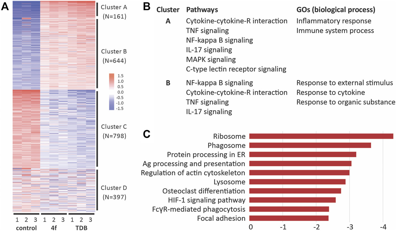 We used RNA sequencing to analyze the transcriptome control of immune cell activation pathways upon the stimulation of GM-CSF treated BMCs with TDM or 4f (Figure 6). A total of 13,797 genes were detected, of which 947 and 656 were differentially upregulated with statistical significance (FDR >0.05, and fold change [FC] > 2) in the TDB and 4f-treated cells, respectively. Further hierarchical clustering analysis of the differentially expressed genes (DEGs) revealed four clusters of expression patterns (A–D) (Figures 6A,B) (Ge et al., 2018). KEGG pathway enrichment of cluster A and B revealed 15 significantly enriched pathway terms in each cluster. The majority of the pathway terms were linked to inflammation and immunity, including cytokine-cytokine receptor interaction, TNF signaling pathway, NF-κB signaling pathway, IL-17 signaling pathway, MAPK signaling pathway and C-type lectin receptor signaling pathway (Figure 6B). Further analysis of DEGs between the 4f and TDB treated groups revealed the relative down-regulation of pathways associated with phagocytosis (Figure 6C), including ribosome, phagosome (including FcRγ-mediated phagocytosis) and lysosome pathways, along with regulation of the actin cytoskeleton and focal adhesion (Luo et al., 2017).