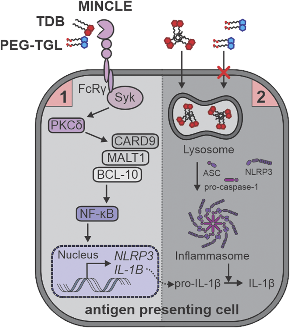 TDB (2), but not PEG-TGL (4f), leads to lysosome-mediated activation of the inflammasome and IL-1b production. TDB (2) and PEG-TGL (4f) are both bind to and signal via Mincle, thus providing the priming signal-1 for inflammasome activation. Only TDB (2) can sufficiently induce phagocytosis, and thus, signal-2 for inflammasome activation. This leads to TDB (2), but not PEG-TGL (4f), mediated IL-1b production.