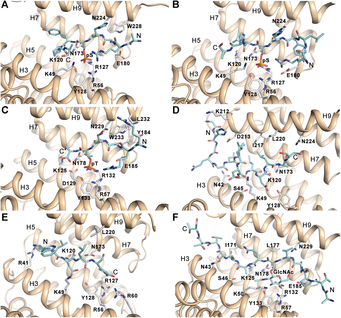 14-3-3 binding motifs. (A) The canonical mode I phosphopeptide (sequence ARSH(pS)YPA) bound to 14-3-3ζ (PDB ID: 1QJB) (Rittinger et al., 1999). (B) The canonical mode II phosphopeptide (sequence RLYH(pS)LPA) bound to 14-3-3ζ (PDB ID: 1QJA) (Rittinger et al., 1999). (C) The canonical mode III phosphopeptide derived from the C-terminus of human DAPK2 (sequence RRSS(pT)S) bound to 14-3-3γ (PDB ID: 7A6R) (Horvath et al., 2021). (D) The non-phosphorylated ExoS peptide (sequence GHGQGLLDALDLAS) bound to 14-3-3ζ (PDB ID: 2O02) (Ottmann et al., 2007b). (E) The non-phosphorylated R18 peptide derived from phage display (sequence WLDLE) bound to 14-3-3ζ (PDB ID: 1A38) (Petosa et al., 1998). (F) The glycosylated Ser-O-GlcNAc peptide (sequence ATPPV(S-O-GlcNAc)QASSTTT) bound to 14-3-3γ (PDB ID: 6BYJ) (Toleman et al., 2018). The figure was prepared with PyMOL (https://pymol.org/2/).
