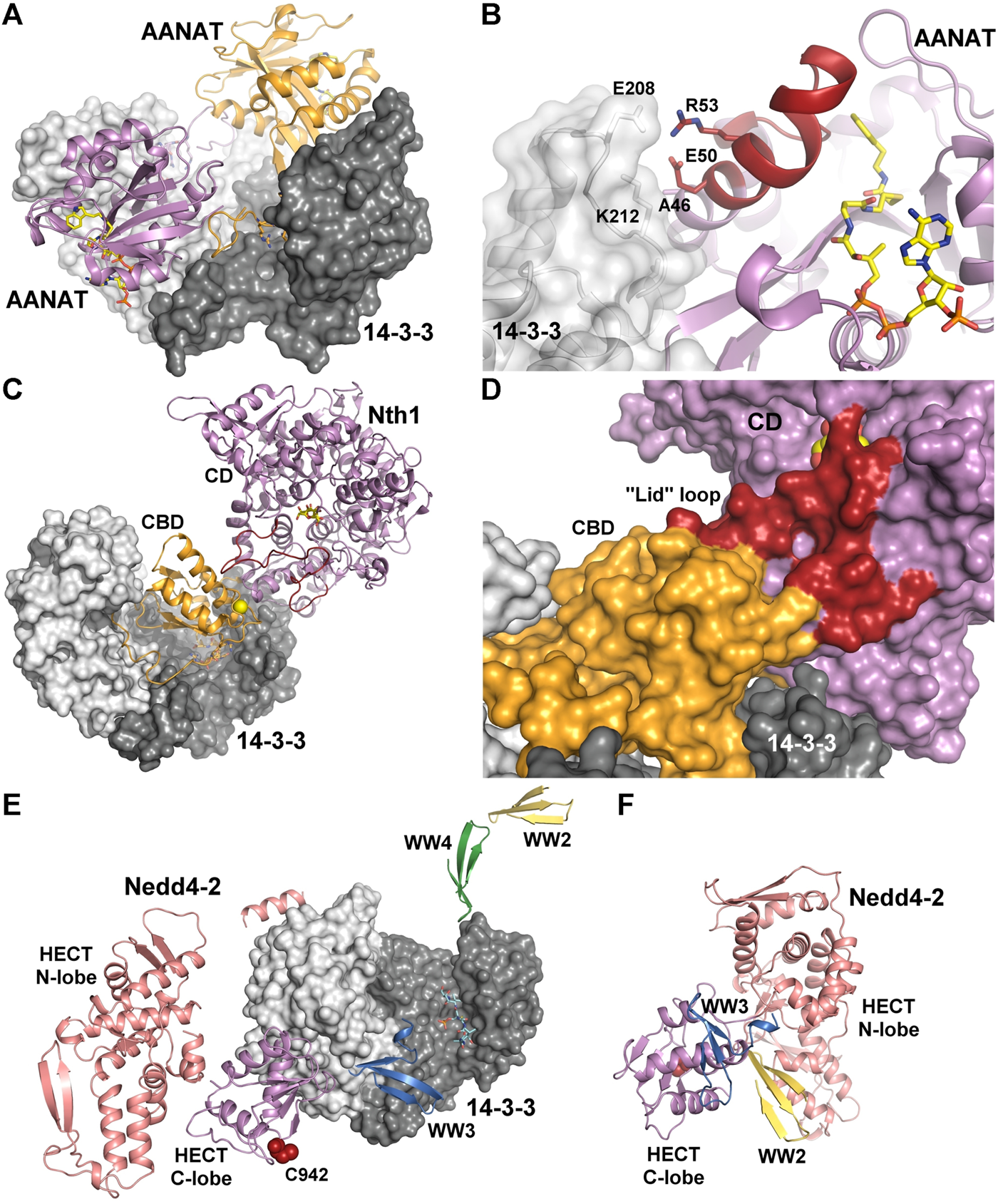 14-3-3 proteins as allosteric modulators of bound enzymes. (A) Crystal structure of the AANAT:14-3-3ζ complex (PDB: 1IB1 (Obsil et al., 2001)). The bisubstrate analog in shown as sticks. (B) Detailed view of interactions between the active site of AANAT and 14-3-3ζ. The bisubstrate analog and selected residues at the binding interface are shown as sticks. The region that undergoes a large structural rearrangement upon substrate binding is shown in dark red (Hickman et al., 1999a; Hickman et al., 1999b). (C) Crystal structure of the Nth1:14-3-3 complex (PDB: 5N6N (Alblova et al., 2017)). The Ca2+ -binding domain (CBD) is shown in orange, the catalytic domain (CD) is shown in violet. The flexible part of the active site, which contains residues required for catalysis and is stabilized upon formation of the complex (the “lid” loop) is shown in dark red. The sucrose bound in the active site and 14-3-3 binding motifs are shown as sticks. Ca2+ ion is shown as yellow sphere. (D) Detailed view of the “lid” loop in surface representation. 14-3-3 binding allows proper orientation of the regulatory CBD of Nth1 relative to the CD, thereby stabilizing the “lid” loop. (E) SAXS- and chemical cross-linking-based model of the Nedd4-2:14-3-3η complex (Pohl et al., 2021). The N- and C-lobes of the catalytic HECT domain of Nedd4-2 are shown in salmon and violet, respectively. WW2, WW3, and WW4 domains are indicated in yellow, blue and green, respectively. The catalytic Cys942 is shown in dark red. The 14-3-3 binding motifs are shown as sticks. (F) SAXS- and chemical cross-linking-based model of apo Nedd4-2. All colors are the same as in panel (E). The figure was prepared with PyMOL (https://pymol.org/2/).