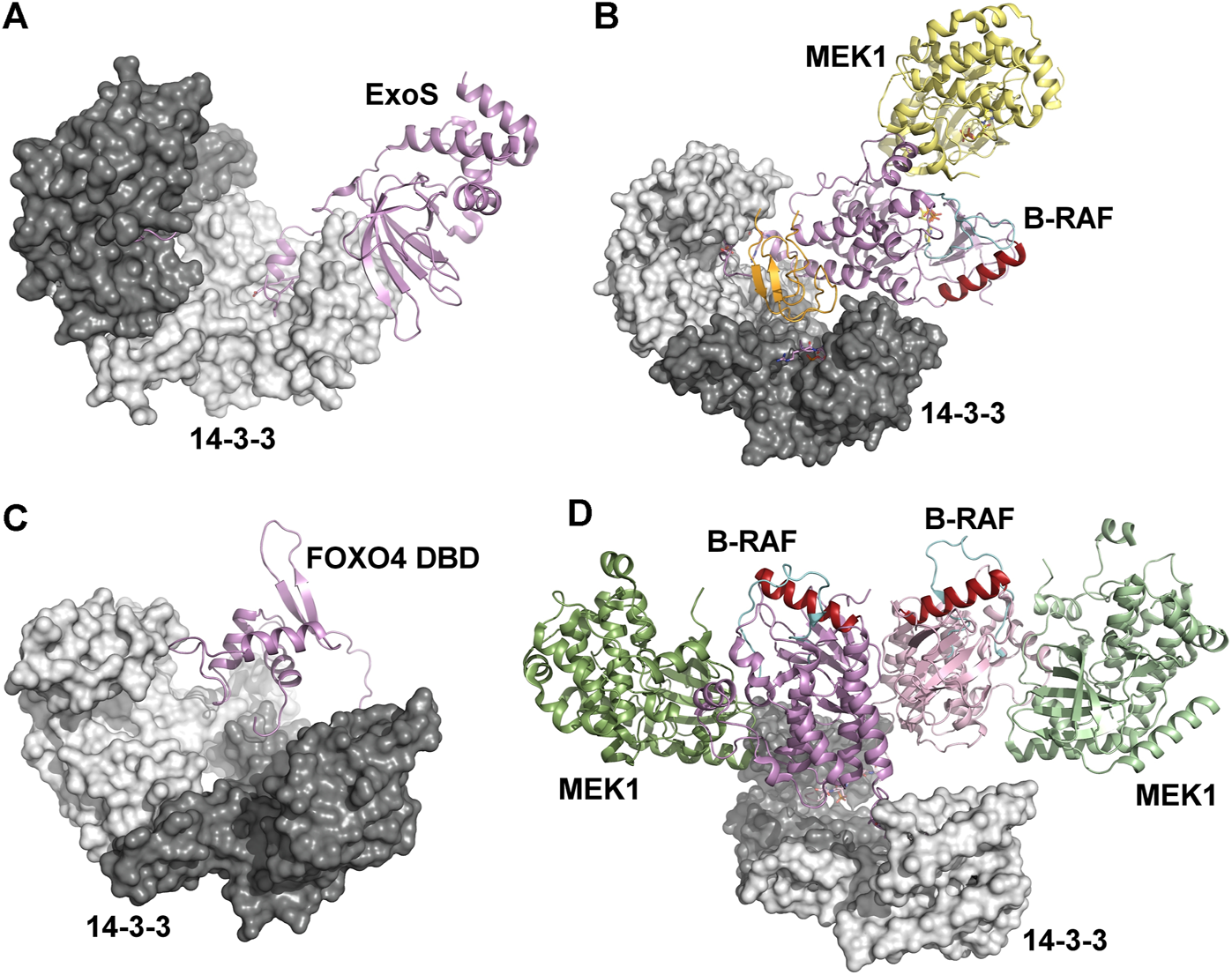 Mechanisms based on physical occlusion and facilitation of protein-protein interactions. (A) Crystal structures of the ExoS:14-3-3β complex showing an extensive hydrophobic binding interface. The amphipathic 14-3-3 binding LDLA-motif is shown as sticks (Karlberg et al., 2018). (B) Autoinhibited B-RAF:MEK1:14-3-3 complex (PDB ID: 6NYB (Park et al., 2019)). The CRD and the catalytic domains of B-RAF are shown in orange and violet, respectively. The position of the C-helix (shown in dark red) and the activation segment (shown in cyan) correspond to the autoinhibited state. (C) The Förster resonance energy transfer-based model of the complex between the FOXO4 Forkhead domain (FOXO4 DBD) and 14-3-3ζ (Silhan et al., 2009). The 14-3-3 binding motifs is located at the C-terminus of FOXO4-DBD. (D) The active B-RAF:MEK1:14-3-3 complex (PDB ID: 6Q0J (Park et al., 2019)). The 14-3-3 dimer anchors C-terminal 14-3-3 binding motifs of two B-RAF molecules, and the B-RAF kinase domains are oriented in the back-to-back fashion with the C-helix (shown in dark red) in a position consistent with the active conformation. The figure was prepared with PyMOL (https://pymol.org/2/).