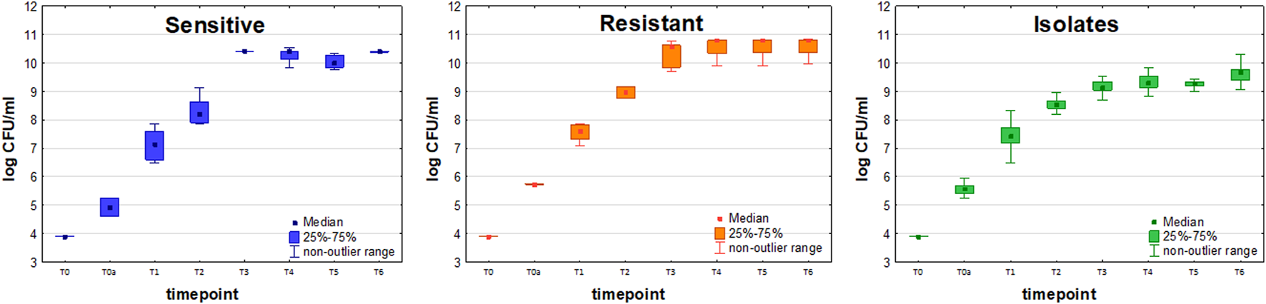 Initial bacteria density (measured immediately after inoculation) ranged from 4 × 104 CFU/ml to 1.8 × 105 CFU/ml for the sensitive strain (n = 6) and from 5.4 × 105 CFU/ml to 5.6 × 105 CFU/ml for resistant strain (n = 9). Slightly lower values were observed for sensitive compared to resistant strain, with the mean values at the end of experiment 2.6 × 1010 CFU/ml at 4.7 × 1010 CFU/ml, respectively. A control measurement was performed at 24 h since inoculation to confirm that a steady state in bacteria growth was reached, after which the experiment was discontinued (Figure 2).