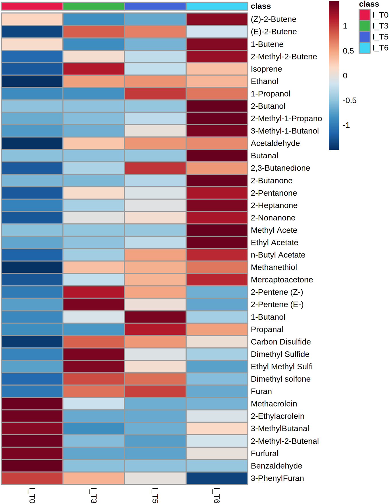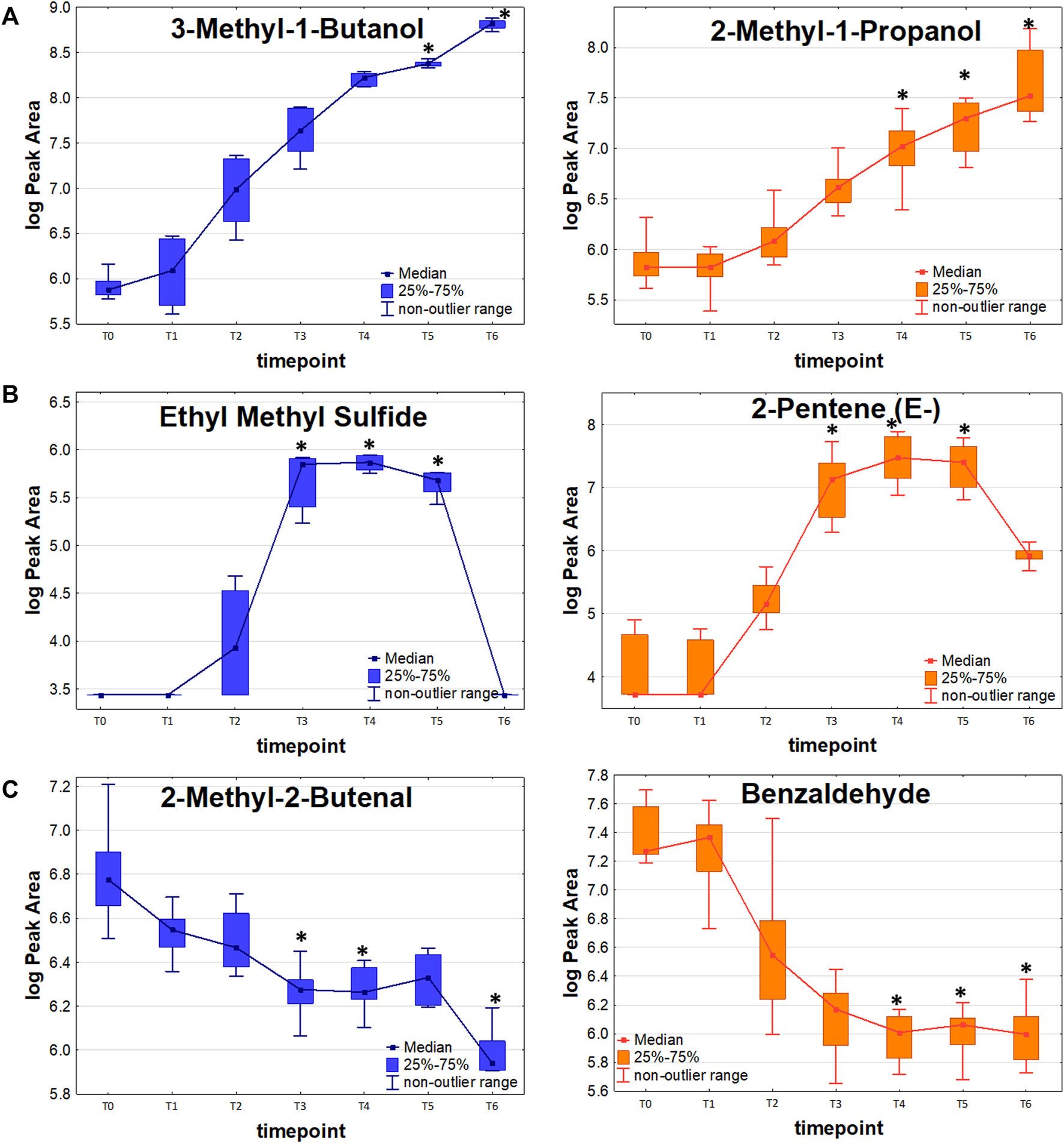 Similarly, metabolites with a temporary maximum in bacteria production that were found at significantly higher levels in the cultures of susceptible strains comprise 2-methyl-2-butene (T4, T5), isoprene (T4), (Z)-2-pentene (T4, T5), (E)-2-pentene (T4, T5), 1-butanol (T4, T5), n-butylacetate (T5), dimethylsulfide (T4) and furan (T4, T5).