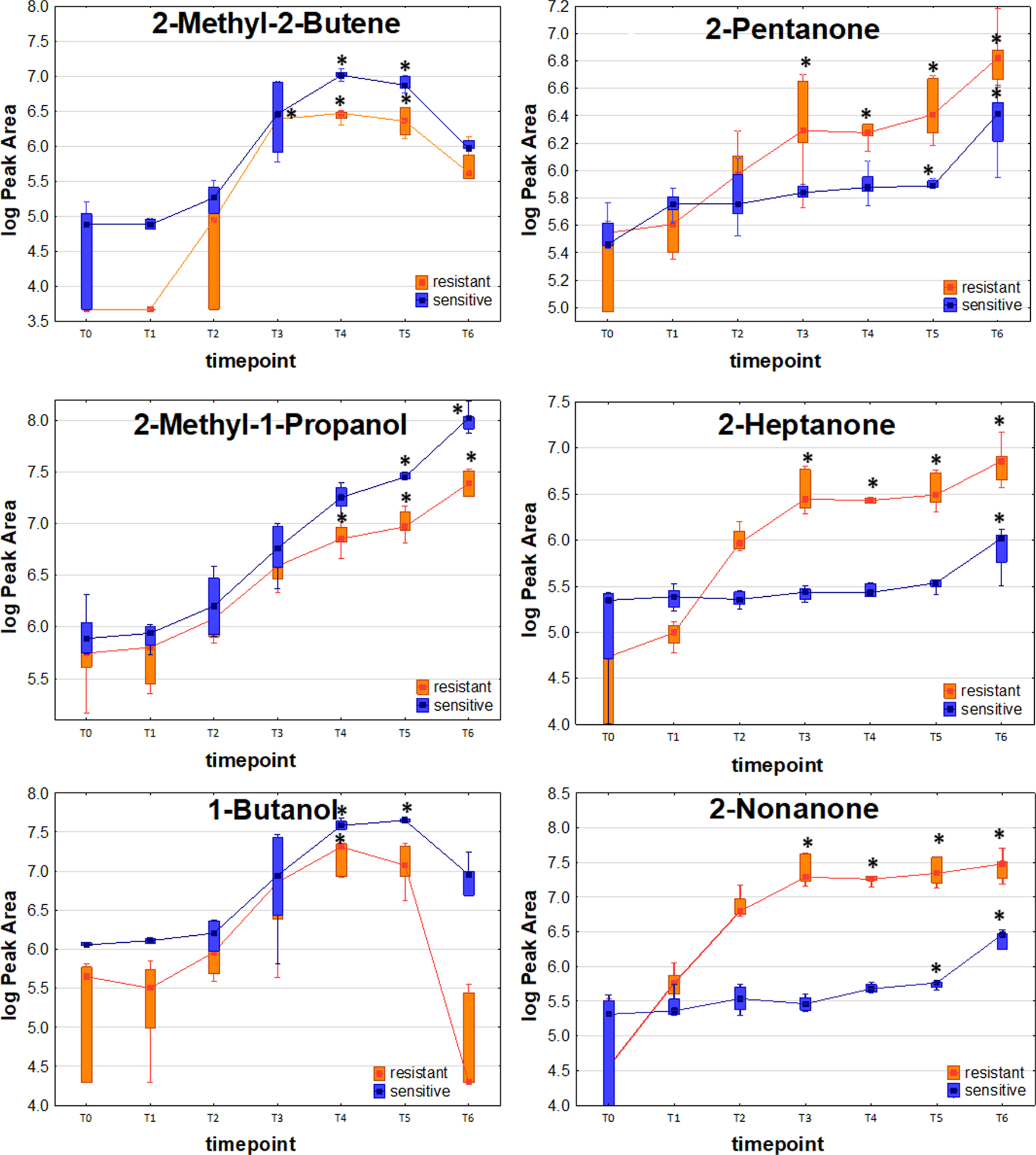 The distinctive compounds were odd-carbon methyl ketones, which were the only VOCs found at significantly higher levels for the resistant K. pneumoniae, compared to the sensitive strain, including 2-pentanone (at T5, T6), 2-heptanone and 2-nonanone (both at T4, T5, T6). The comparison of release profiles for exemplary VOCs is given in Figure 4.