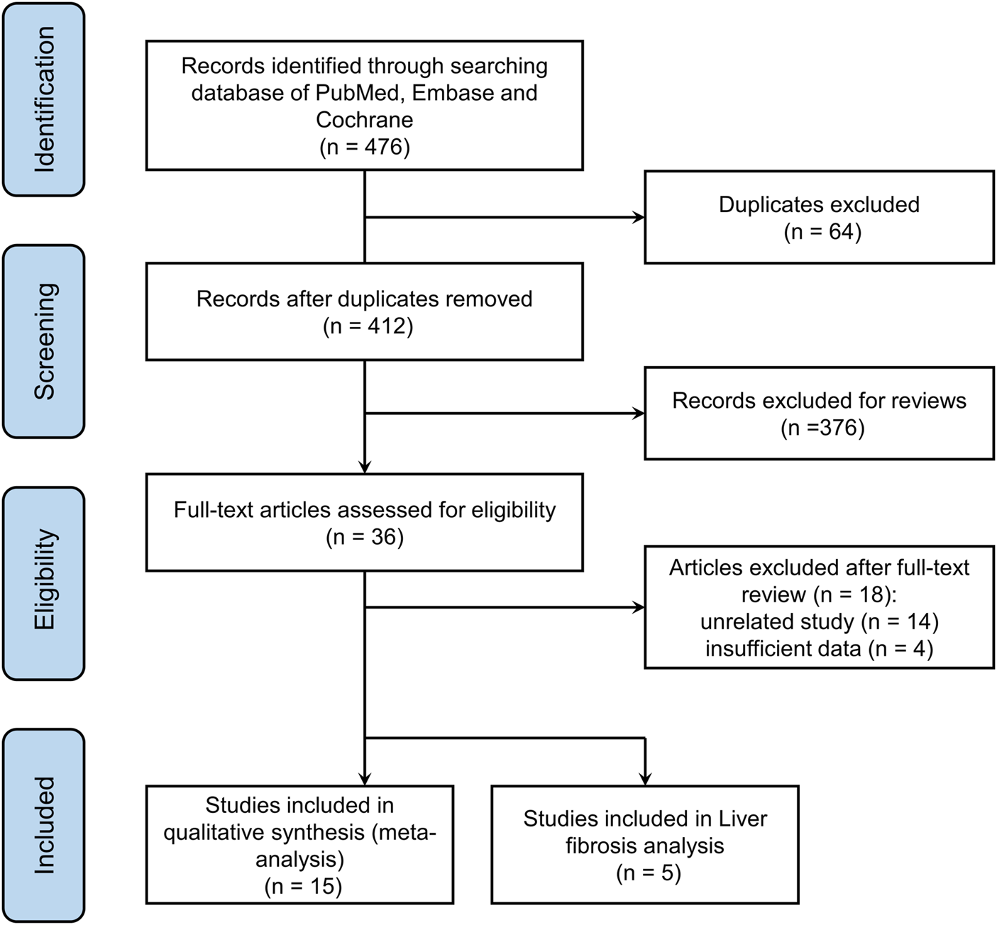 A total of 476 articles were obtained, and 412 articles were obtained after excluding duplicate literature. By reading the titles and abstracts, 376 articles were excluded. After reading the full text, 36 articles were screened out. Excluding 18 non-randomized controlled trials and outcome indicators, 18 studies were finally included in this meta-analysis. Fifteen of the 18 studies evaluated the association between NAFLD and DR (Targher et al., 2008; Targher et al., 2010a; Yoneda et al., 2012; Lv et al., 2013; Yang et al., 2013; Kim et al., 2014; Somalwar and Raut, 2014; Vendhan et al., 2014; Lin et al., 2016; Yan et al., 2016; Afarideh et al., 2019; Zhang et al., 2019; Lombardi et al., 2020a; Mikolasevic et al., 2021; Wen et al., 2021), five studies evaluated the association between liver fibrosis and DR in patients with NAFLD (Lombardi et al., 2020a; Lombardi et al., 2020b; Sawadjaan Leila and Ong Janus, 2020; Leite et al., 2021; Mikolasevic et al., 2021), and two of these studies included both of the above-mentioned research objectives (Lombardi et al., 2020a; Mikolasevic et al., 2021). The details of identifying qualified research and the exclusion criteria are given in Figure 1.