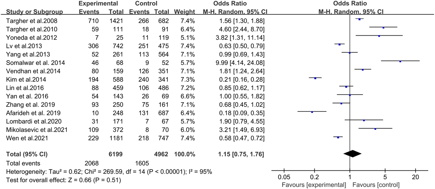 In a pooled analysis of the 15 included studies, there was no association between NAFLD and DR in diabetic patients (OR = 1.15, 95% CI 0.75–1.76; p = 0.51) (Figure 2). However, the heterogeneity test showed that I2 = 95% (χ2 = 269.59, p < 0.001), indicating significant heterogeneity; thus, this study used the random effect model to draw a more conservative conclusion. Furthermore, the large heterogeneity suggested that we should view the results dialectically and conduct further in-depth research and analysis.