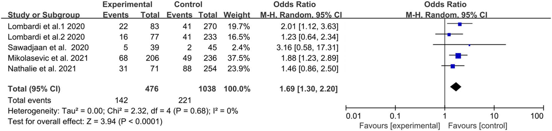 Five studies assessed the association between liver fibrosis and DR in diabetic patients. Overall, this analysis showed a positive association between liver fibrosis and DR in patients with diabetes (OR = 1.69, 95% CI 1.30–2.20; p < 0.0001) (Figure 3). Heterogeneity test showed I2 = 0% (χ2 = 2.32, p < 0.680), indicating that there was almost no heterogeneity. The random effects model was used to reach more conservative conclusions.