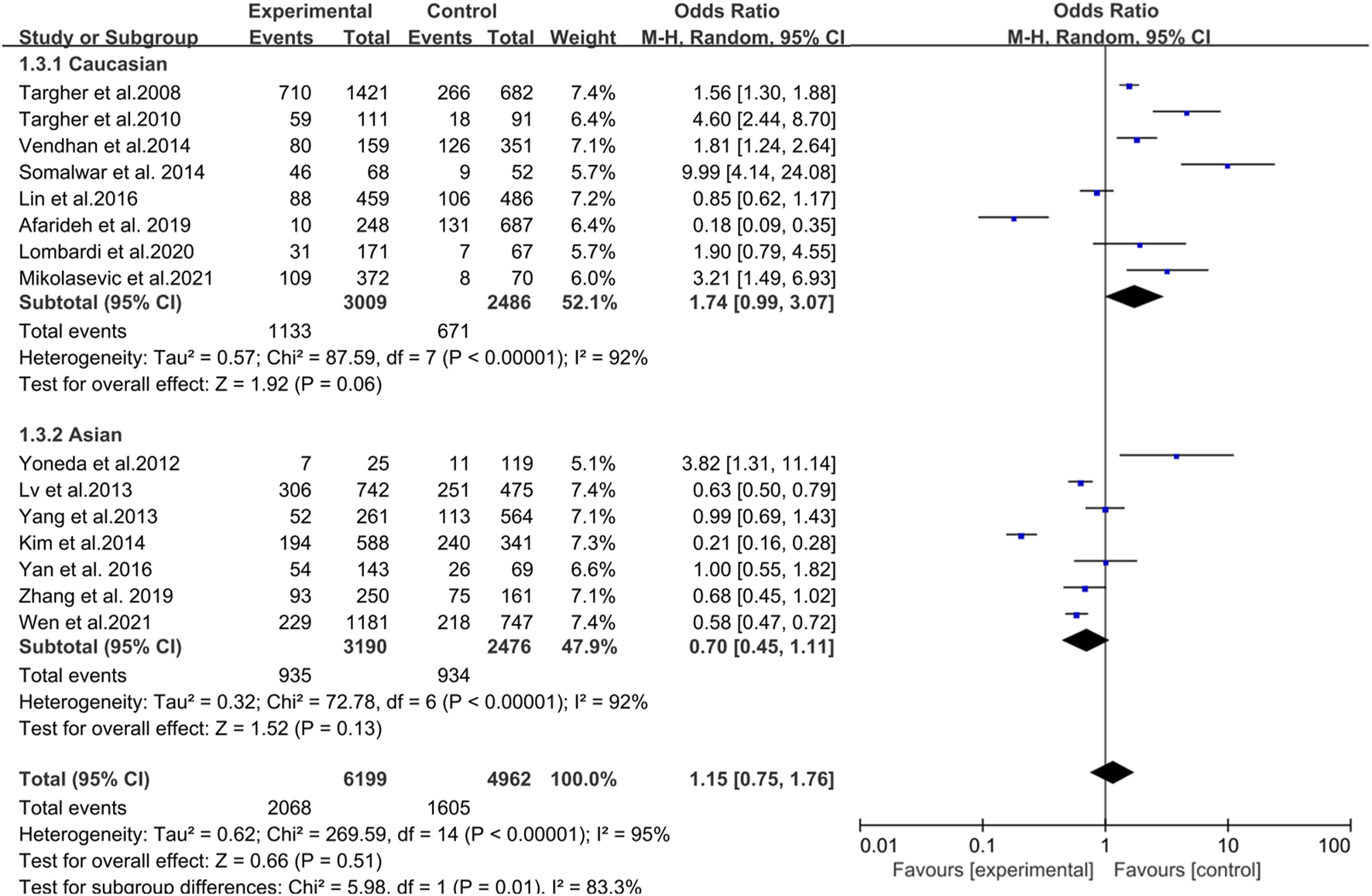 FIGURE 5. Meta-analysis of association between non-alcoholic fatty liver disease and the risk of diabetic retinopathy in diabetes mellitus based on the different races.