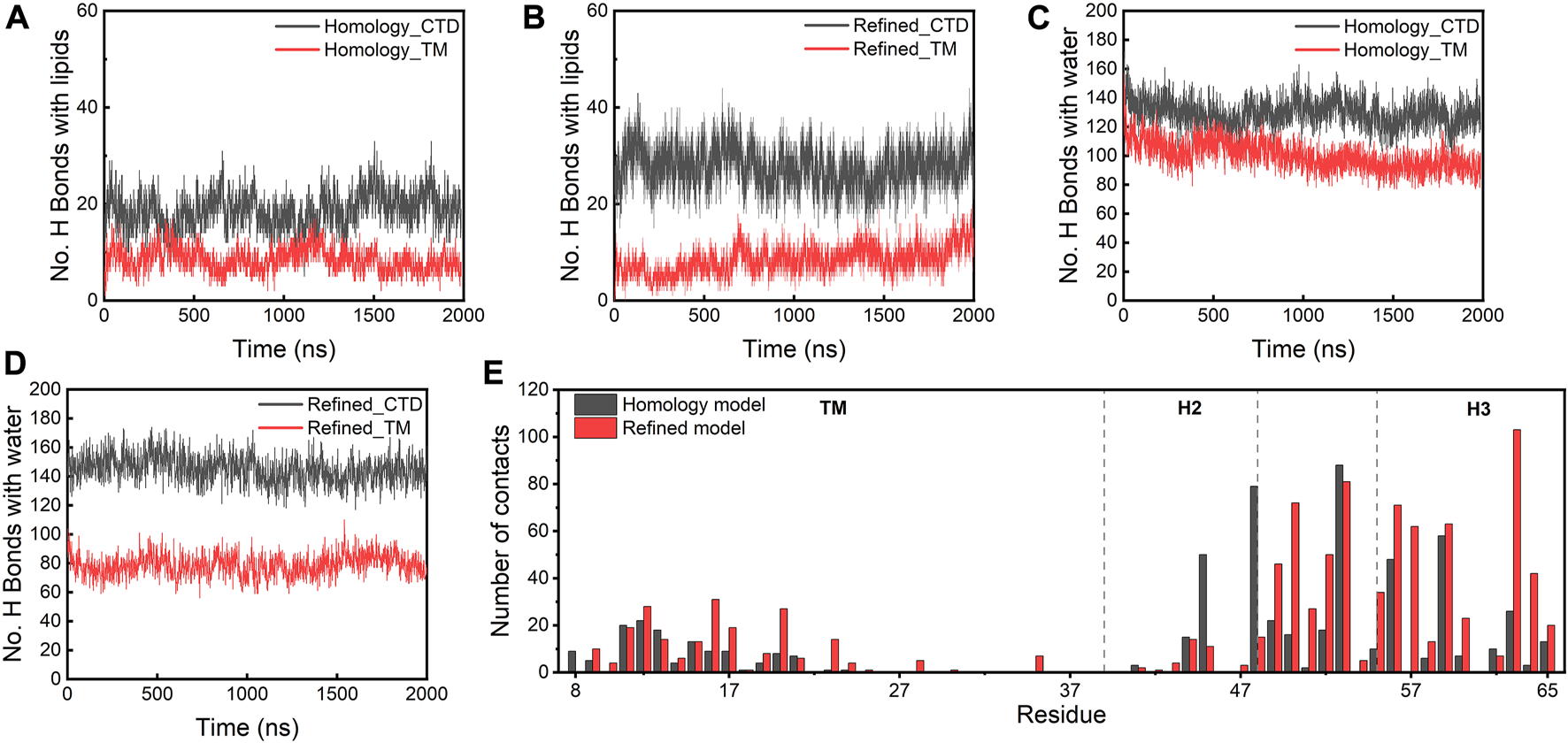 (A–D) H bonds formed between lipids/water and the homology and refined models. (E) Total number of contacts with lipids per residue (within a 4 Å cut-off) in both models.