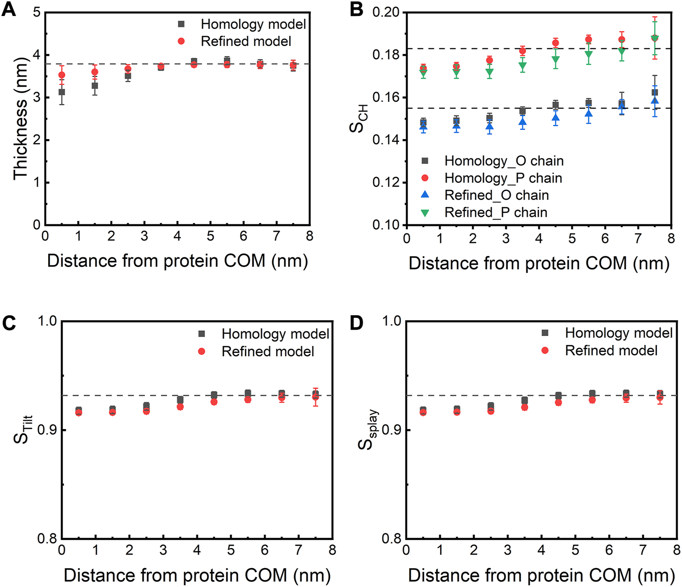 (A) Membrane thickness and (B) order parameter as a function of the distance from the COM of the E protein. The dashed lines indicate the corresponding values calculated from the AA-MD simulation (200 ns) of a pure POPC bilayer. (C) STilt and (D) SSplay as a function of the distance from the COM of the E protein. STilt is calculated as the average tilt angle of a lipid with respect to the bilayer normal. SSplay reflects the divergence of local lipids tilt.