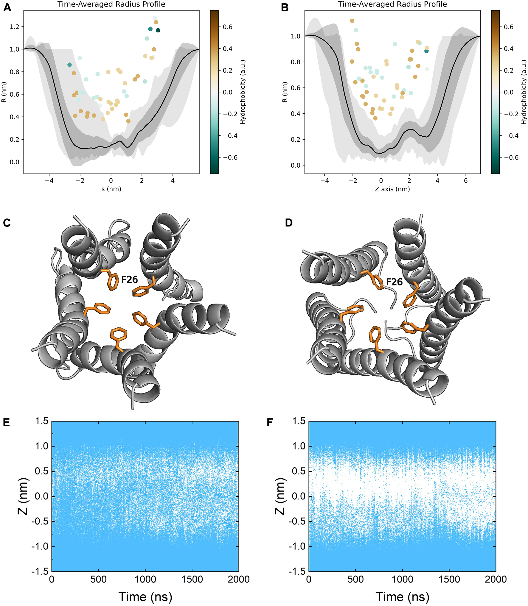 Time-averaged pore radius profiles of (A) the homology model and (B) the refined model. The grey shaded areas correspond to the one-sigma (dark gray) and two-sigma (light gray) confidence intervals. The pore lining residues (facing the channel more than 50% of the time) are indicated as dots colored by their hydrophobicity. Top view of the bottleneck residue PHE26 in the channel of (C) the homology model and (D) the refined model. Pore hydration profiles of (E) the homology model and (F) the refined model. Coordinates of water molecules along the z axis were plotted as a function of time. Each water molecule was represented by a blue dot.