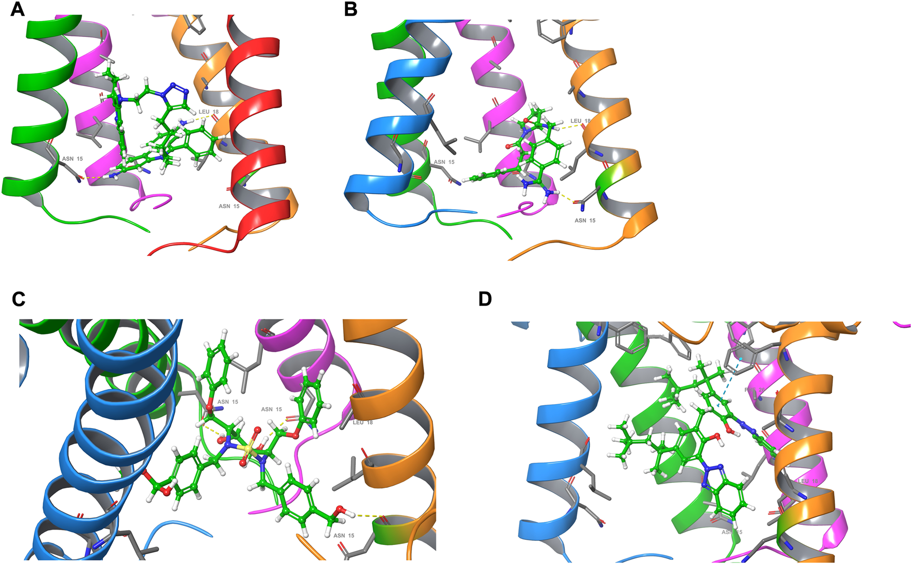 Docking poses of (A) DB03005, (B) DB06942, (C) DB04042 and (D) DB11262. For clarity, one of the chains of the E protein is not shown.