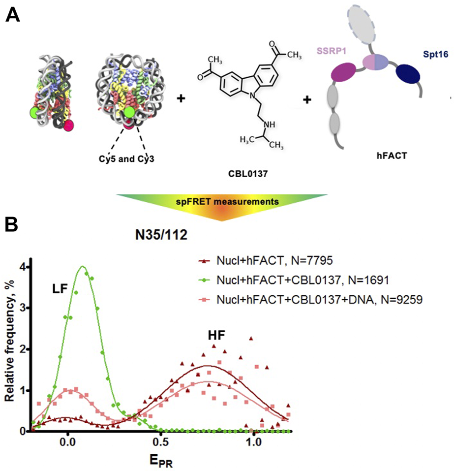 For spFRET experiments N35/112 nucleosomes were gel purified and analysed at a concentration of 0.5–1 nM after incubation in the presence of FACT (0.1 μM) and/or CBL0137 (2 μM) in the buffer containing 20 mM Tris-HCl pH7.9, 150 mM KCl for 5 min at 25°C.