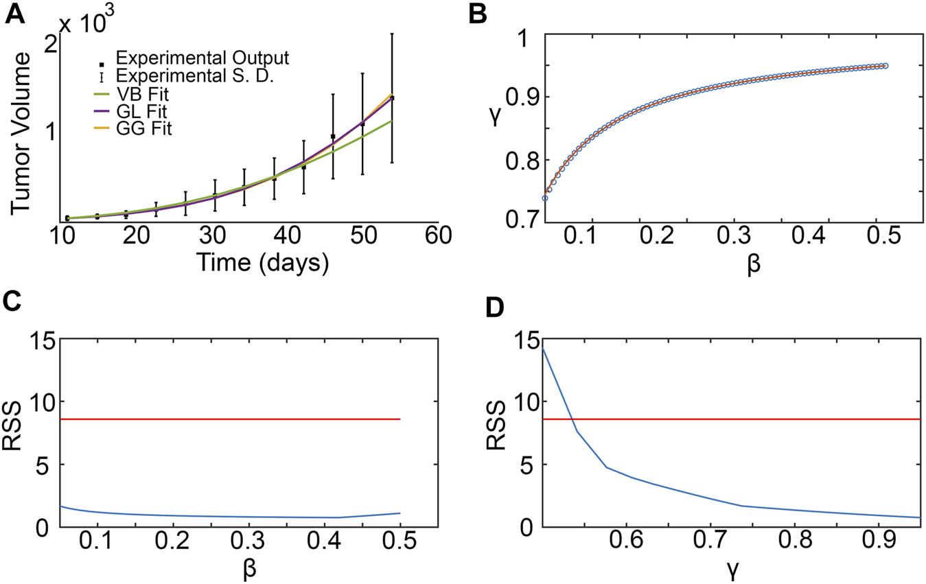 Surrogate model parameter estimation and practical identifiability analysis using breast cancer xenograft data from (Zhou et al., 2019). (A) Surrogate model fit to experimental tumor volume time-courses. (B) Inferred relationship between γ and β using the profile-likelihood method (Eisenberg and Jain, 2017), with combinations plotted as blue squares, and potential combination form plotted as a red curve. (C,D) Profile likelihoods (solid blue lines) for estimated surrogate model parameters: (C)β, and (D)γ. Thresholds for the 95% confidence intervals are shown as red lines and RSS stands for residual sum of squares.