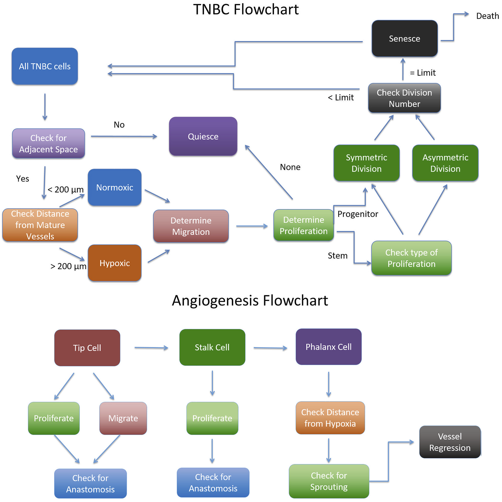 The cancer module runs through each cancer cell in a random order so as not to introduce bias. Each cancer cell can migrate, proliferate, quiesce, senesce and/or die in each iteration. First, the cell determines whether it is normoxic or hypoxic by checking whether it is less than 200 microns from a mature vessel. Hypoxic cells are more migratory, increasing the speed they migrate 3-fold, and are less proliferative, decreasing their chances to proliferate by half. In order for the cancer cell to migrate or proliferate there must be available space. If there is no available space, the cell becomes quiescent. The cell decides whether it will migrate based on its migration probability. The number of voxels the cell migrates is based on its migration speed. Therefore, each migrating cell randomly chooses an open space to migrate into and repeats this as many times as its migration speed.