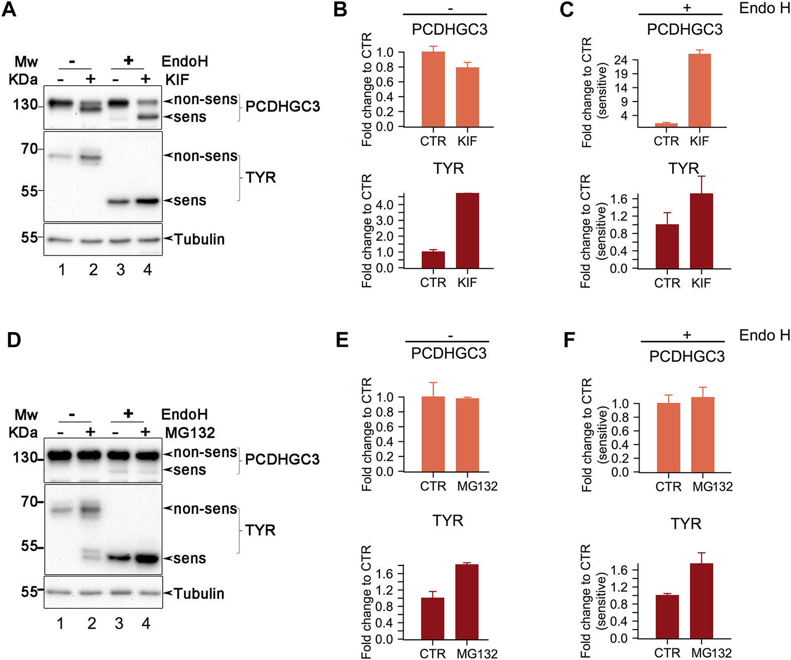Both candidates revealed increased signal intensity for the Endo H products following KIF treatment of cells (Figure 5A, upper and middle panels, compare lanes 3 and 4). Comparison of the relative abundance of the Endo H fraction in KIF treated with CTR cells, revealed that there was a considerable increase of non-processed (immature) molecules following KIF treatment, for PCDHGC3, (Figure 5A upper panel, compare lanes 3 with 4, and Figure 5C upper panel). TYR displayed similar changes compared with control (Figure 5C, lower panel), although to a lesser extent. These results indicate that the accumulation observed following KIF treatment of the Endo H fraction of TYR and PCDHGC3 are similarly impacted. However there is a different response of the PCDHGC3 mature glycoforms, suggesting the existence of two different molecular pools for this protein, compared with TYR, which respond different to KIF treatment. The upregulation observed in Figure 5C, upper panel, could result following intracellular blockage of class I-dependent maturation events of PCDHGC3, or following to the blockage of degradation for the non-mature PCDHGC3 molecular pool.