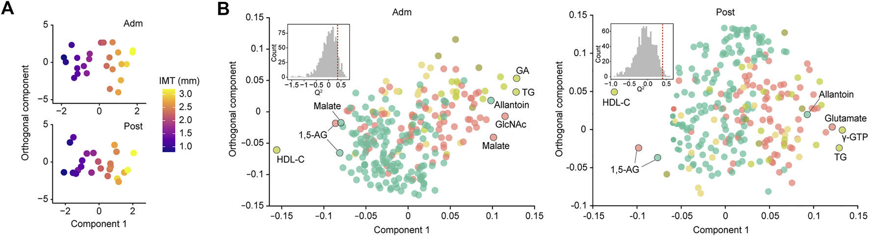 FIGURE 2. Global analysis of correlation of IMT with clinical and metabolomic features at admission (Adm) and after treatment (Post). (A) OPLS score plot showing distribution of study participants according to IMT. (B) OPLS loading plot showing color-coded distribution of predictors from different data blocks (pear: serum biochemical parameters, olive: urine biochemical parameters, light yellow: other clinical indices, red: plasma metabolome, mint: saliva metabolome), with the right side showing those associated with higher IMT. Inset shows statistical validation using permutation analysis (n = 999 permutations). GA, glycated albumin; TG, triglycerides; γ-GTP, γ-Glutamyl transpeptidase; HDL-C, high-density lipoprotein cholesterol; GlcNAc, N-acetylglucosamine; 1,5-AG, 1,5-anhydroglucitol.