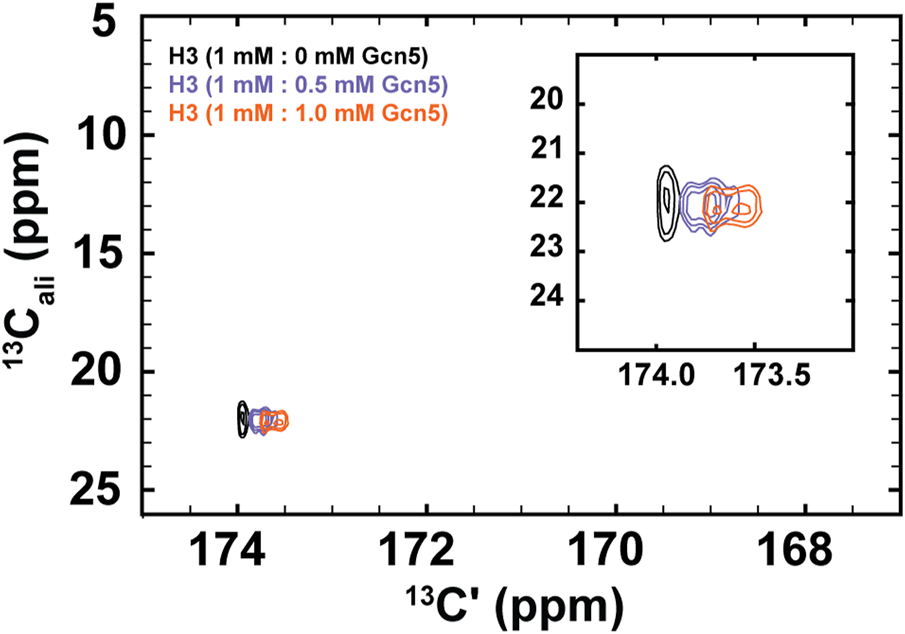 NMR experiments to monitor Gcn5 bromodomain binding to H3 were conducted on a 11.7 T Bruker Avance-3 spectrometer equipped with a TCI-cryoprobe. 1H-methyl-start [13C,13C] CaliCO-Kac experiments were collected with 1,024 direct data points and 128 indirect data points, 16 scans, and a sweep width of 20 ppm with a Center of 172 ppm in the direct dimension and 80 ppm with a Center of 172 ppm in the indirect dimension, and a recycle delay of 1 s.
