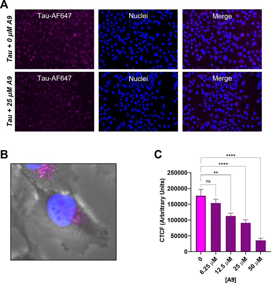 FIGURE 5. A9 reduces tau uptake in human H4 neuroglioma cells. (A) Microscopy images of tau uptake assay. H4 cells were treated with 0.1 μM tau-AF647 in the presence and absence of 25 μM A9. Tau-AF647 was imaged using the CY5 channel, nuclei were stained with Hoechst 33258 and imaged using the DAPI channel. (B) Magnification of a single cell showing tau uptake localized around the paranuclear region. (C) Quantification of 5A is reported as Corrected Total Cell Fluorescence (CTCF), which shows a dose-dependent inhibition of tau internalization by A9.