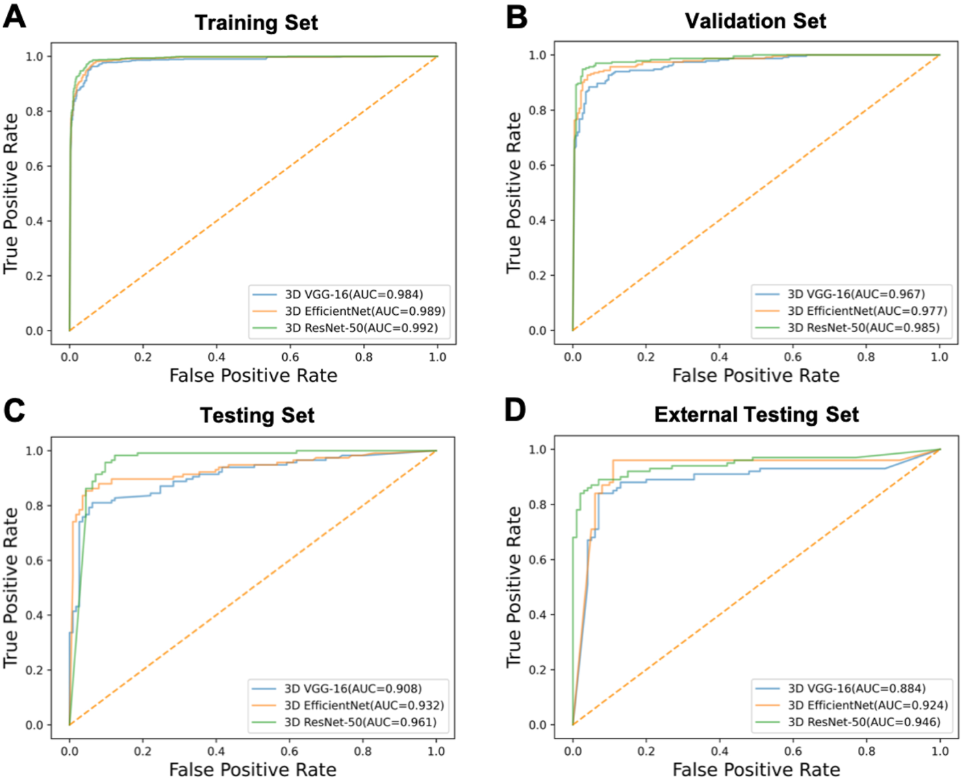 The ROC curves of the models. ROC curves of 3D VGG-16, 3D EfficientNet and 3D ResNet-50 models on the (A) training, (B) validation, (C) testing and (D) external testing sets.