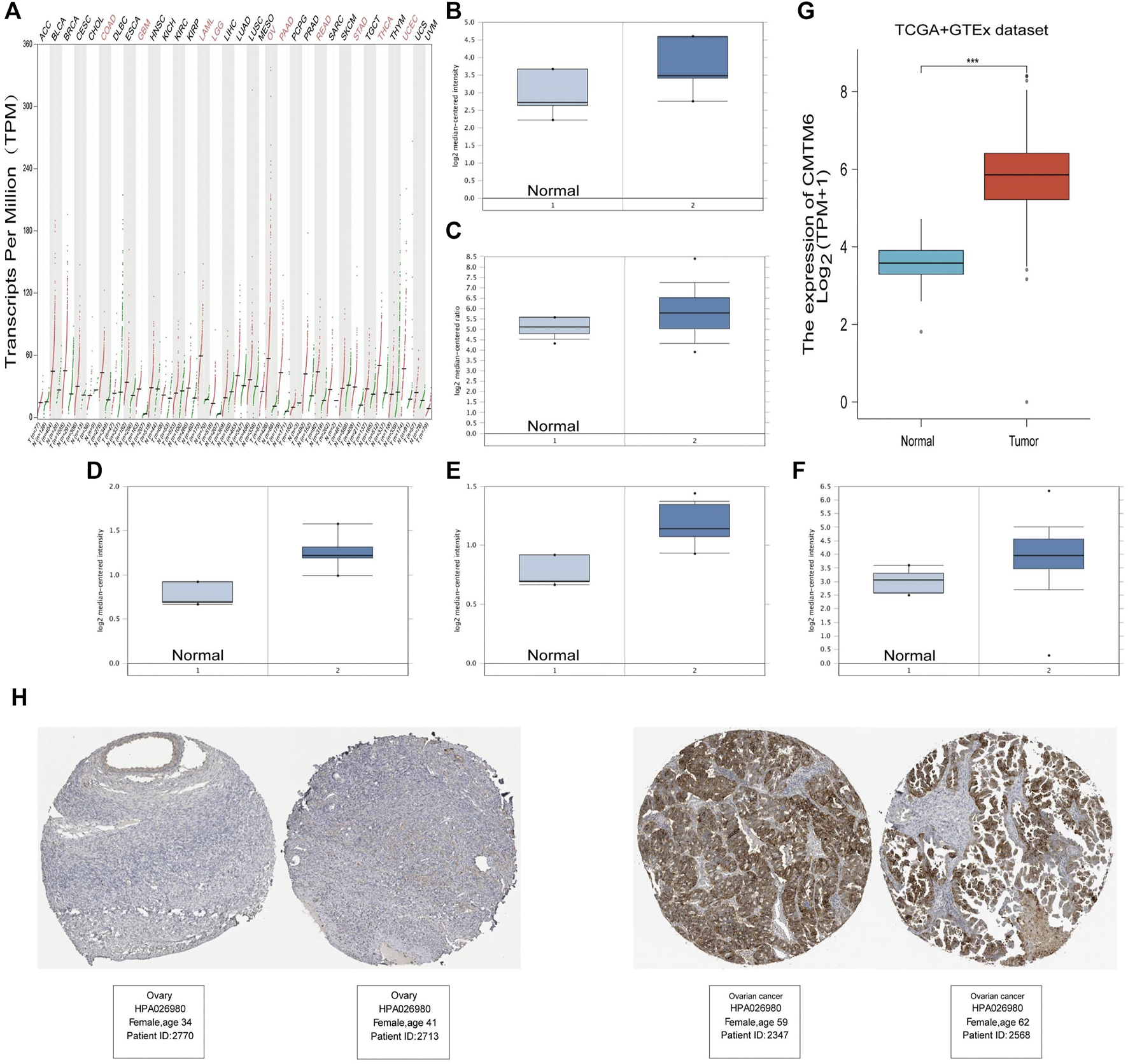 High expression of CMTM6 in various cancers and OV. (A) mRNA level of CMTM6 in human cancer tissues and corresponding normal tissues from GEPIA2. The expression of CMTM6 in the OV samples derived from the Oncomine database. Data shown for (B) ovarian endometrioid adenocarcinoma, (C) ovarian serous adenocarcinoma, (D) ovarian clear cell adenocarcinoma, (E) ovarian mucinous adenocarcinoma, and (F) ovarian carcinoma. (G) CMTM6 expression in OV matched TCGA and GTEx data. (H) Representative immunohistochemistry images and detailed information on the expression of CMTM6 in OV tissues and non-tumor tissues based on the THPA database. ***P < 0.001.