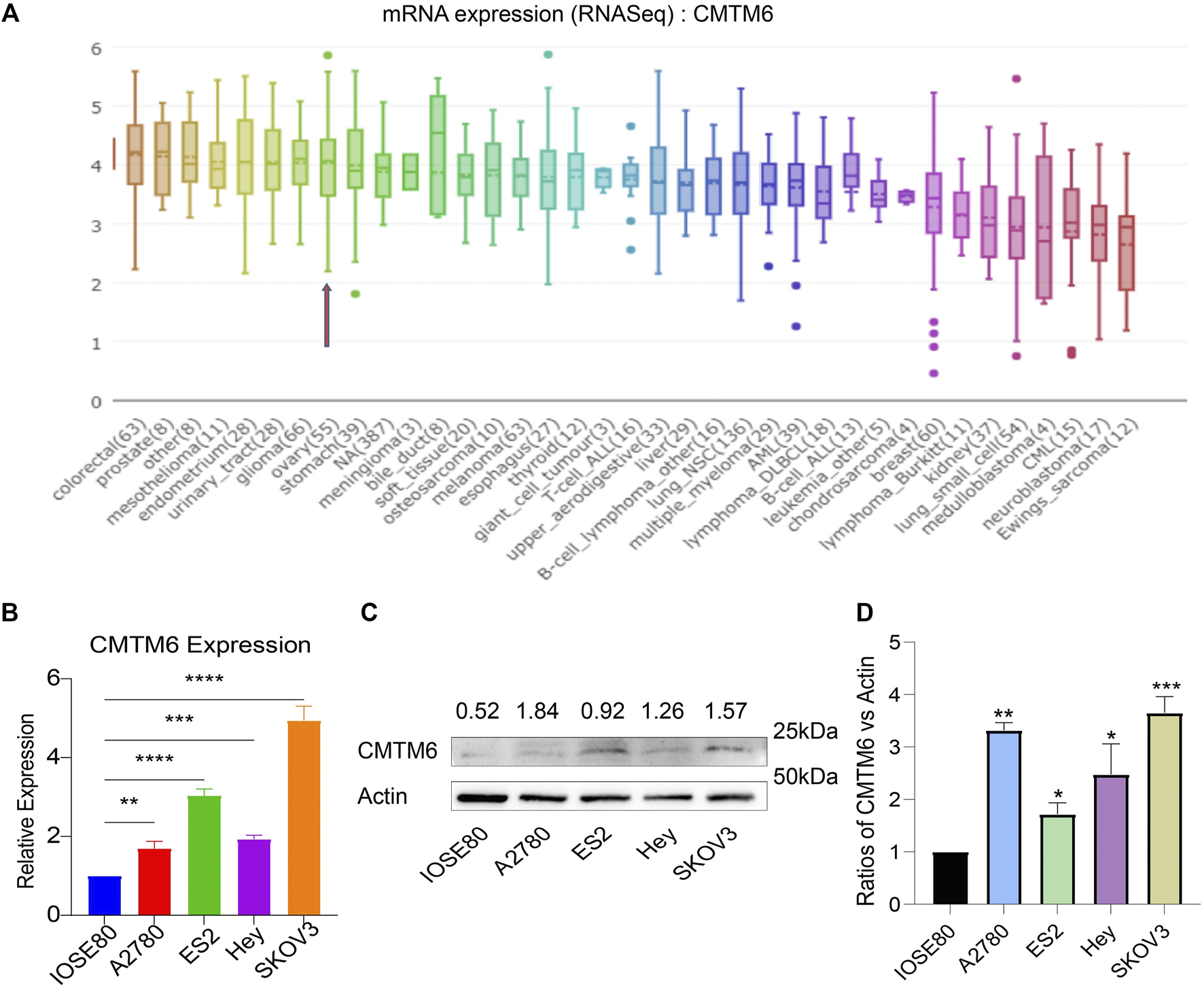 CMTM6 expression in OV cell lines. (A) Cell line indicated by the red arrow is ovarian cancer. CMTM6 was overexpressed in OV cell lines. (B) CMTM6 mRNA expression in human OV cell lines. (C,D) CMTM6 protein expression in human cell lines. Densitometric quantification was shown. Actin served as the loading control. *p < 0.05, **p < 0.01, ***p < 0.001, and ****p < 0.0001.