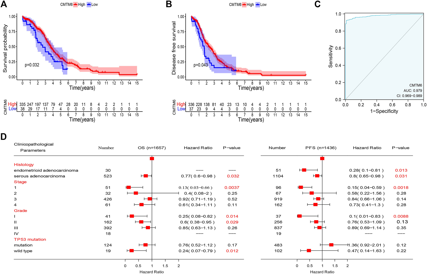 Prognostic value of CMTM6 expression and ROC analysis. (A,B) Survival analysis of CMTM6 in OV showed that high CMTM6 expression has an increased OS and DFS based on TCGA database. (C) ROC curve indicated the better performance of survival prediction. (D) Forest plot showed the correlation between CMTM6 expression and clinicopathological parameters in OV patients.