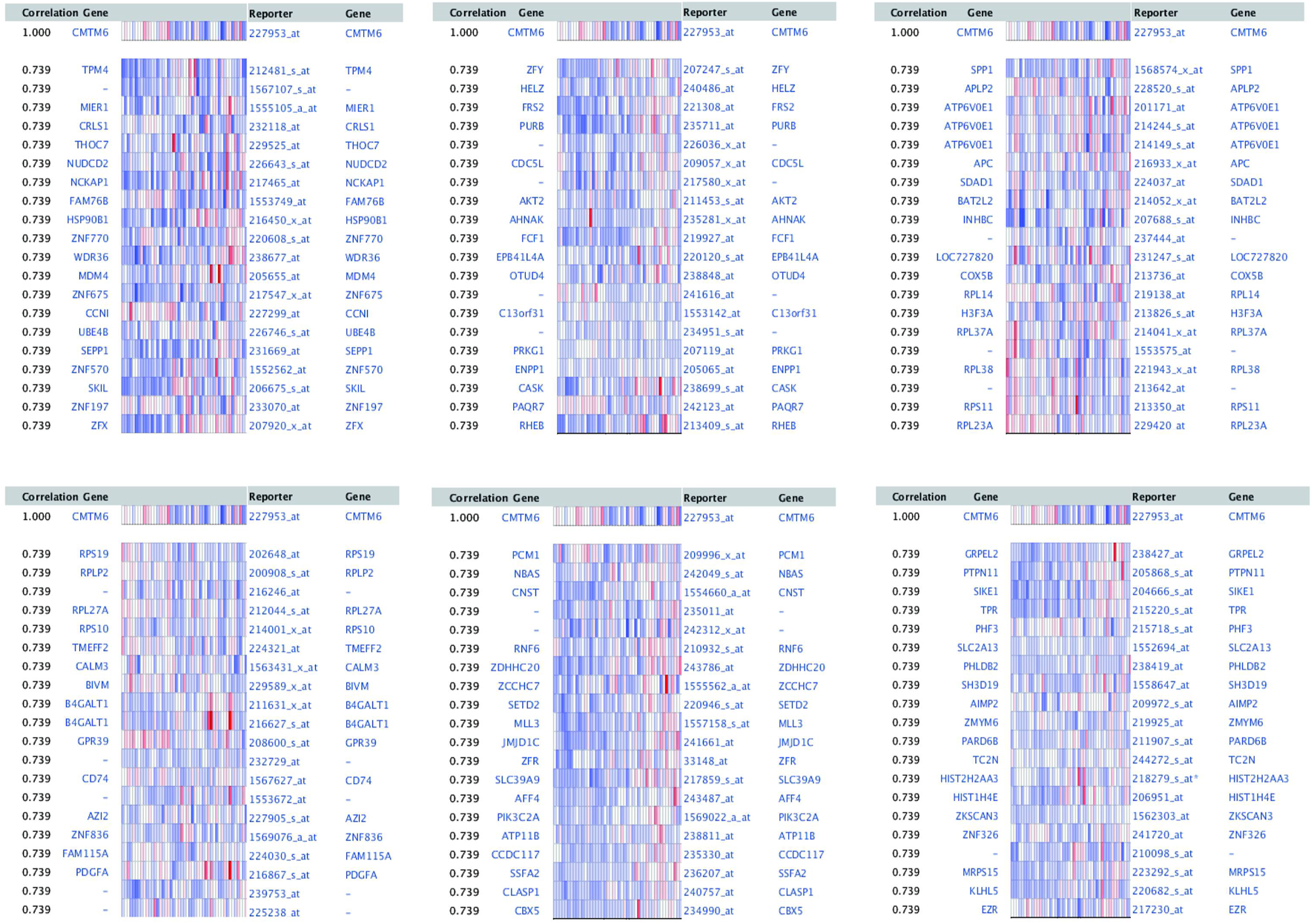 The top 100 coexpressed genes with CMTM6 were extracted from coexpression analysis datasets in the Oncomine database. Fold change≥2 and P-value≤0.001 were selected as thresholds.