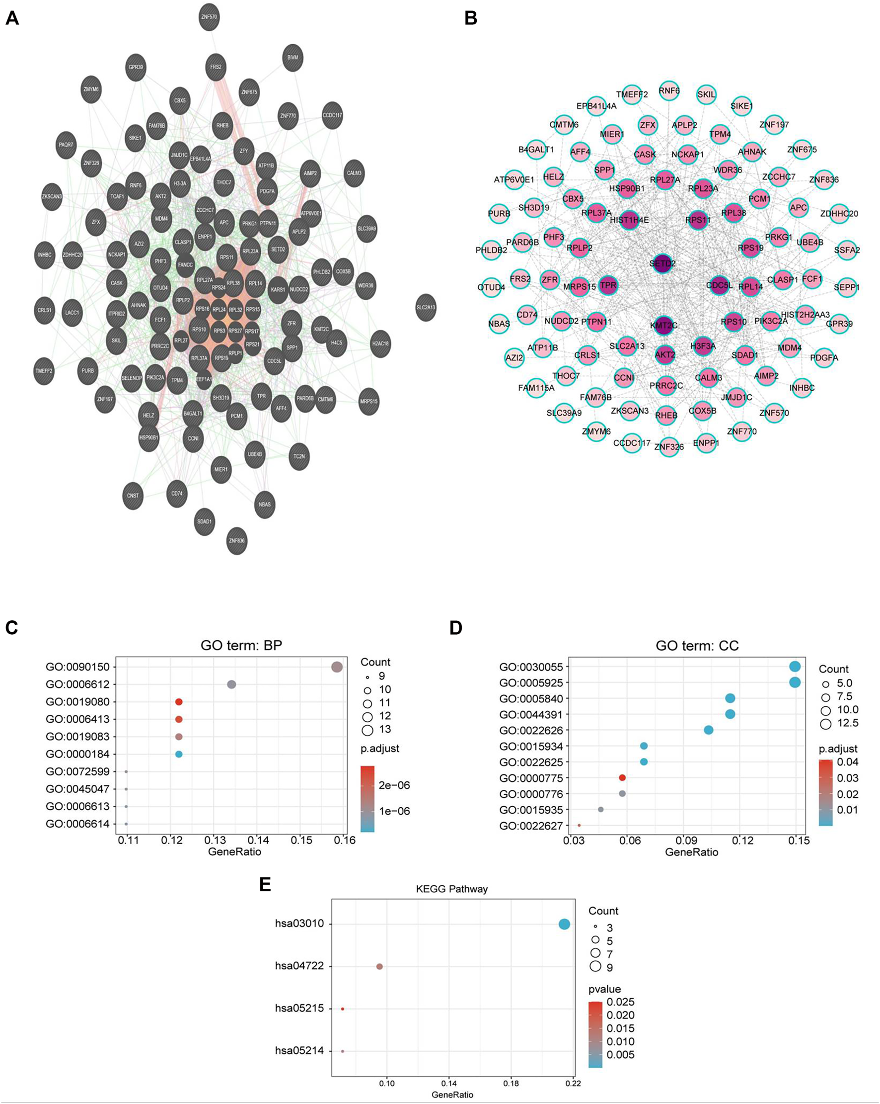 To explore the biological significance of CMTM6 in OV, we performed coexpression data mining to obtain the top 100 coexpressed genes of CMTM6 from a large cluster of 19,574 genes across Tothill Ovarian 295 samples in the Oncomine database (Figure 5). A PPI network analysis of coexpressing genes was generated by utilizing the GeneMANIA database (Figure 6A) and moved to the bioinformatics software platform Cytoscape (Version 3.8.2) to visualize the interaction network (Figure 6B). Afterward, to obtain a more extensive and in-depth cognition of the selected gene, we attempted to perform GO and KEGG pathway enrichment analyses of coexpressed genes. GO analysis showed that CMTM6 coexpressed genes were remarkedly enriched in the BP and CC. The top 10 significant terms of BP and CC are presented in Figures 7A,B. More specifically, coexpressed genes of CMTM6 were enriched in BPs principally involving establishment of protein localization to membrane, protein targeting to membrane, viral gene expression, translational initiation, viral transcription, nuclear-transcribed mRNA catabolic process, nonsense-mediated decay, establishment of protein localization to the endoplasmic reticulum, protein targeting to the ER, cotranslational protein targeting to membrane, SRP-dependent cotranslational protein targeting to membrane, and so on (Figure 7A; Supplementary Table S1). Regarding CCs, the genes were involved in cell–substrate junction, focal adhesion, ribosome, ribosomal subunit, cytosolic ribosome, large and small ribosomal subunit, cytosolic large ribosomal subunit, chromosome, centromeric region, kinetochore, and so on (Figure 7B; Supplementary Table S2). KEGG pathway analysis showed that CMTM6 coexpressed genes were remarkedly enriched in the ribosome, neurotrophin signaling pathway, and pathways in prostate cancer and glioma (Figure 7C; Supplementary Table S3).